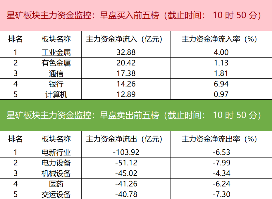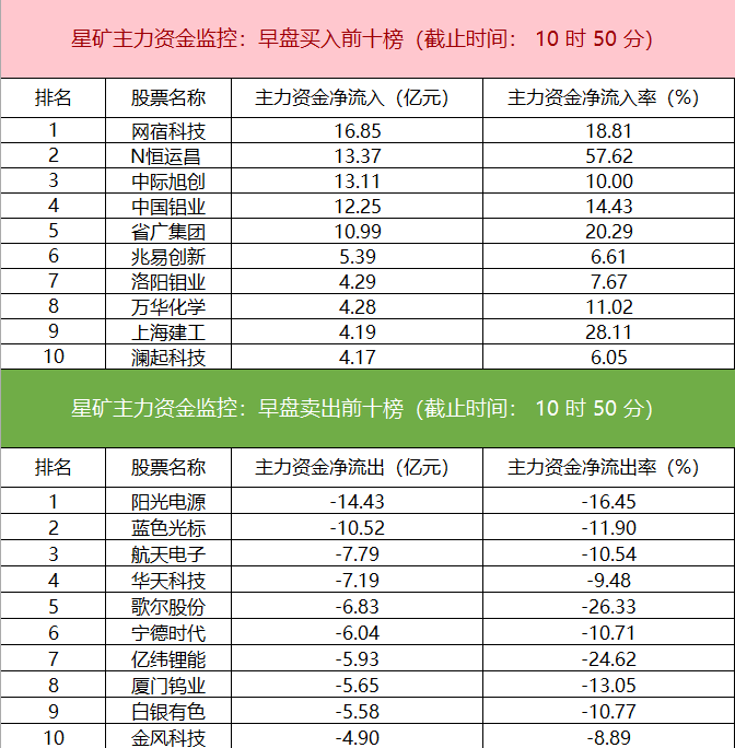 财联社1月28日电,财联社星矿数据显示,今日早盘主力资金净流入工业金属、有色金属、通信等板块,净流出电新行业、电力设备、机械设备等板块,其中电新行业净流出超103亿元。个股方面,网宿科技一度涨停,主力资金净买入超16.85亿元位居首位,N恒运昌、中际旭创、中国铝业获主力资金净流入居前;阳光电源遭净卖出超14亿元,蓝色光标、航天电子、华天科技资金净流出额居前。