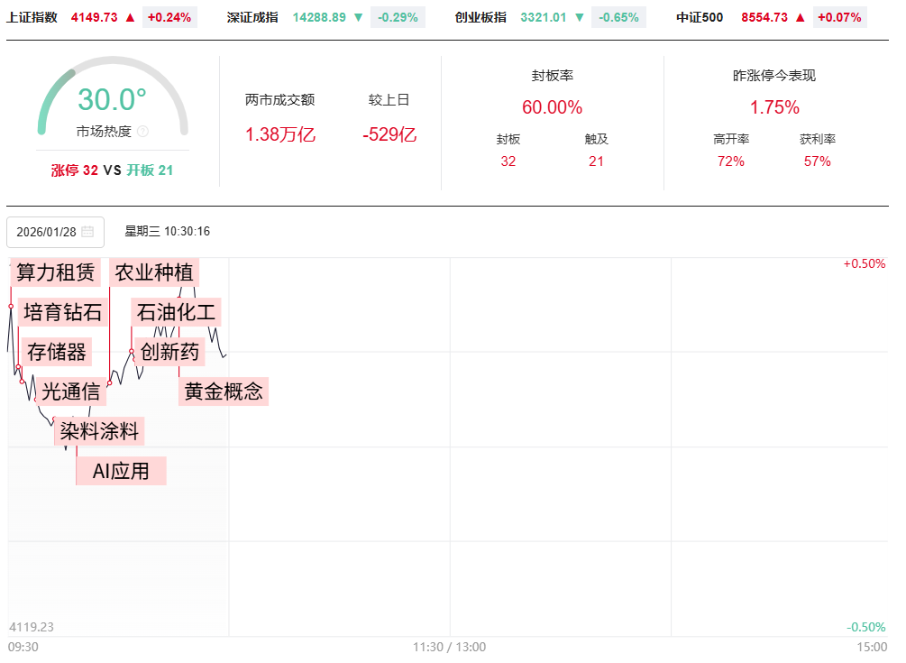 财联社1月28日电,市场焦点股白银有色(6板)高开0.16%,贵金属概念股四川黄金(9天5板)高开5.30%、招金黄金(7天4板)高开6.49%、豫光金铅(3板)高开6.15%,光伏股拓日新能(10天5板)高开2.87%、宇晶股份(8天4板)高开7.26%,AI应用端的天地在线(7天4板)高开6.34%、达安基因(2板)低开3.11%,农药股中农联合(3板)高开0.43%,医药股凯普生物(创业板2板)低开0.46%、光正眼科(2板)竞价跌停。