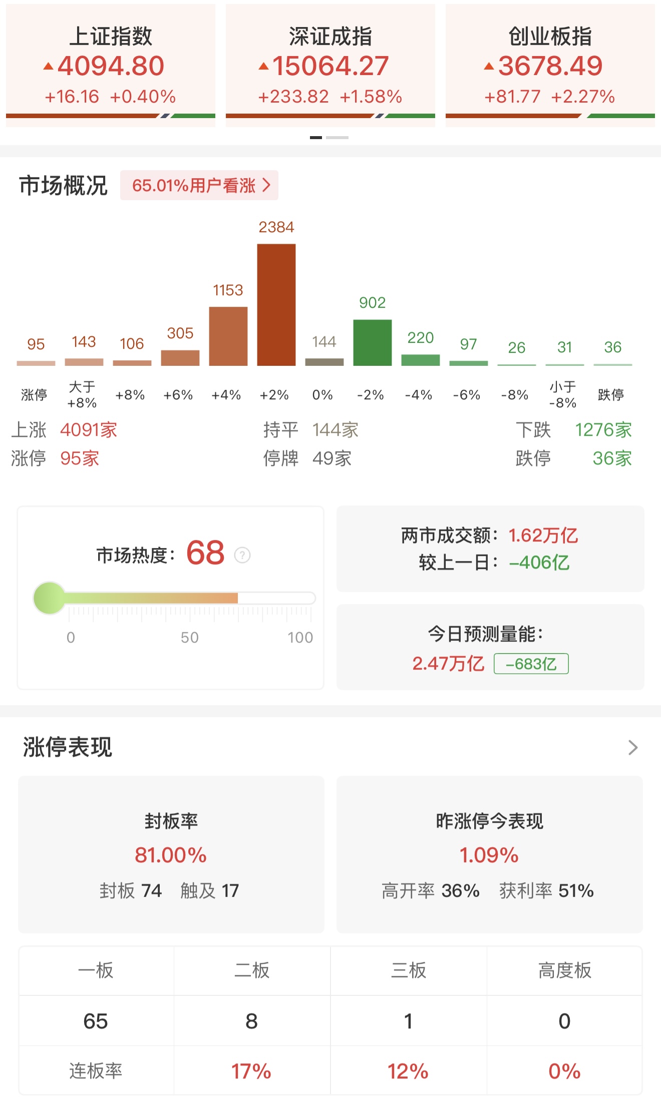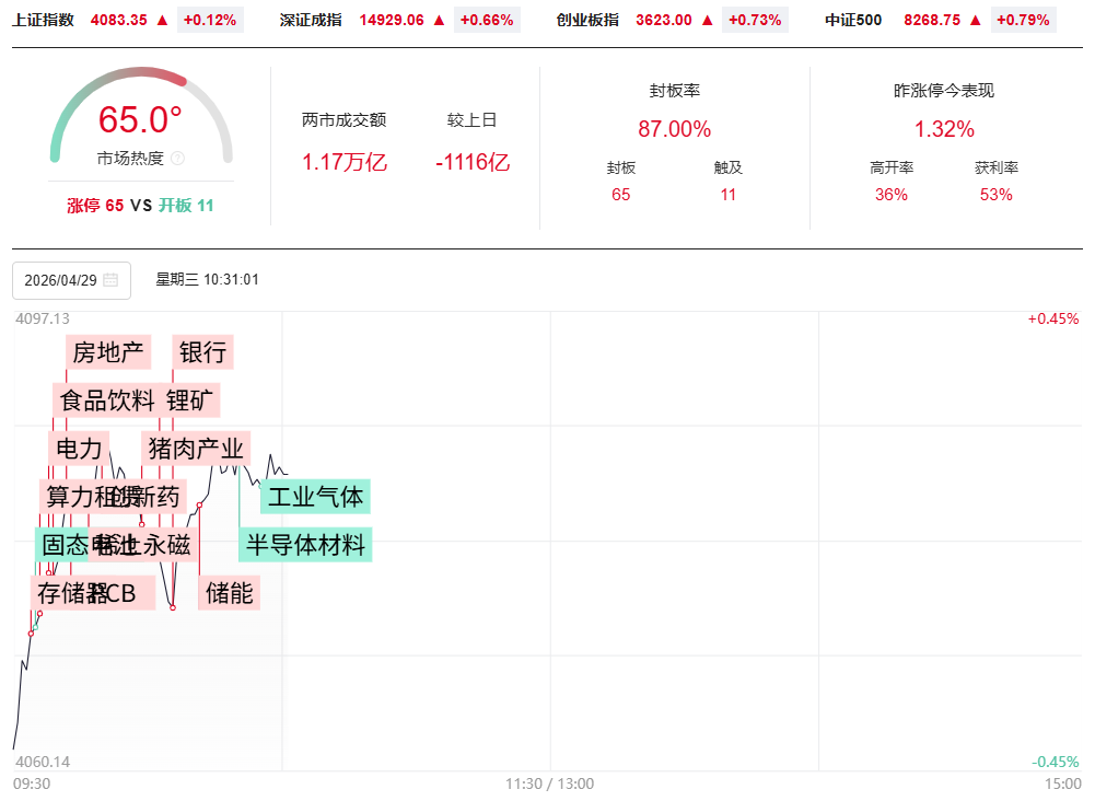 财联社4月29日电,市场早盘低开高走,创业板指涨超2%,深成指涨超1%。沪深两市半日成交额1.62万亿,较上个交易日缩量406亿。盘面上热点快速轮动,全市场近4100只个股上涨,其中95只个股涨停。从板块来看,算力租赁概念反复活跃,行云科技触及20cm涨停,利通电子、三人行、华升股份2连板,莲花控股、天娱数科涨停。稀土永磁概念快速走强,北方稀土、中国稀土、华宏科技均涨停。PCB产业链延续强势,山东玻纤3天2板,宏和科技涨停续创历史新高。猪肉概念表现活跃,金新农涨停,正邦科技触及涨停。CPO概念盘中震荡回升,源杰科技续创历史新高,剑桥科技、瑞斯康达双双涨停。下跌方面,半导体材料股震荡调整,靶材、工业气体、光刻胶方向领跌,欧莱新材、华特气体、安集科技纷纷下挫。截至收盘,沪指涨0.4%,深成指涨1.58%,创业板指涨2.27%。