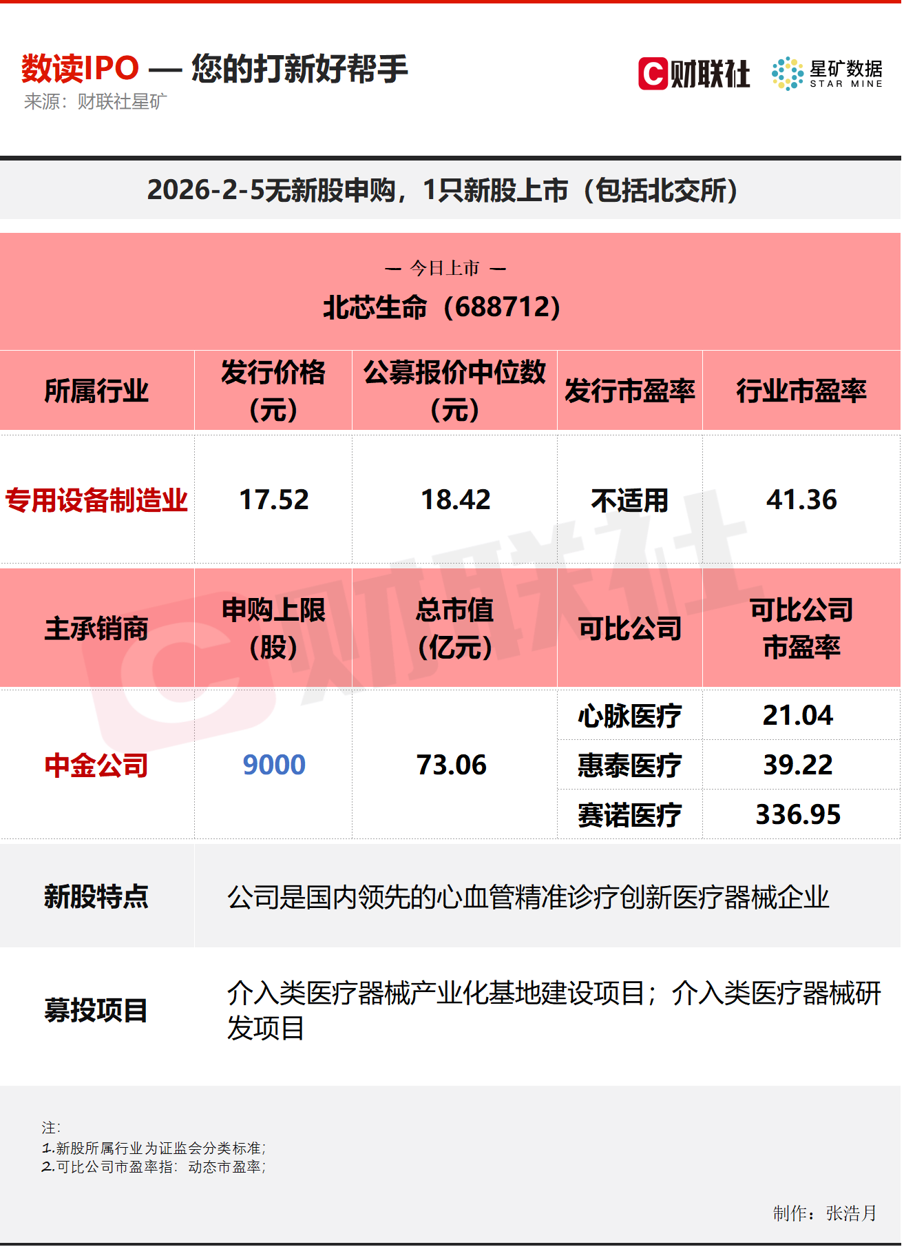 财联社2月5日电,今日无新股申购;有1只新股上市,为科创板的北芯生命。北芯生命是国内领先的心血管精准诊疗创新医疗器械企业。