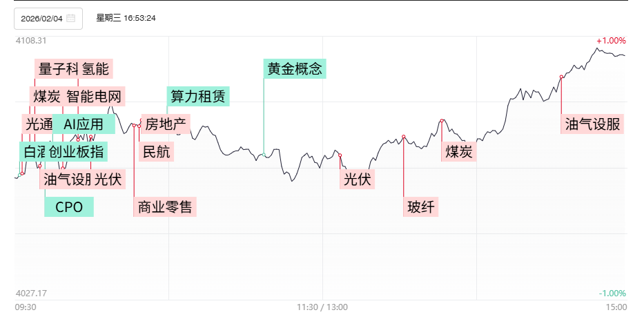 财联社2月4日电,市场探底回升,沪指重返4100点,深成指翻红,此前一度跌超1%,创业板指午后跌幅收窄。沪深两市成交额2.48万亿,较上一个交易日缩量633亿。盘面上,市场热点快速轮动,全市场超3200只个股上涨。从板块来看,煤炭概念掀起涨停潮,十余只成分股涨停,陕西黑猫、兖矿能源、中煤能源涨停。太空光伏概念爆发,中来股份20cm涨停,国晟科技2连板。机场航运概念走强,中国东航、华夏航空涨停。房地产板块表现活跃,荣安地产、财信发展、我爱我家涨停。氢能源概念快速拉升,京城股份、致远新能涨停。下跌方面,AI应用、贵金属、算力硬件等板块跌幅居前。其中AI应用概念集体下挫,引力传媒、天地在线跌停,值得买、世纪恒通等多股大跌。截至收盘,沪指涨0.85%,深成指涨0.21%,创业板指跌0.4%。