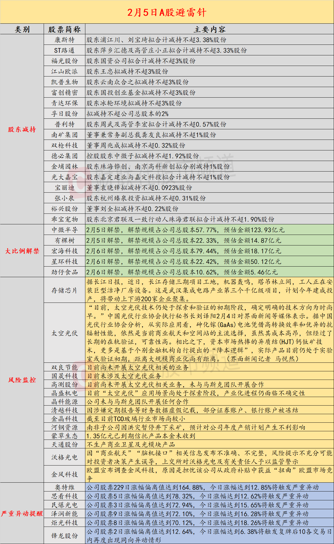 昨日公告的A股拟减持的公司数量较之前有所增多,康斯特股东浦江川、刘宝琦拟合计减持不超3.38%股份,福光股份股东国资公司拟合计减持不超3%股份;有棵树、中微半导将迎来超二成以上解禁;中国光伏行业协会表示,太空光伏技术仍处于探索和验证的初期阶段;2连板双良节能公告,目前尚未开展太空光伏相关的业务;大摩报告显示,数据中心折旧费用或被大幅低估;2连板国晟科技称目前未涉及太空光伏业务;美股三大指数收盘涨跌不一,AMD跌超17%创2017年以来最差单日表现。