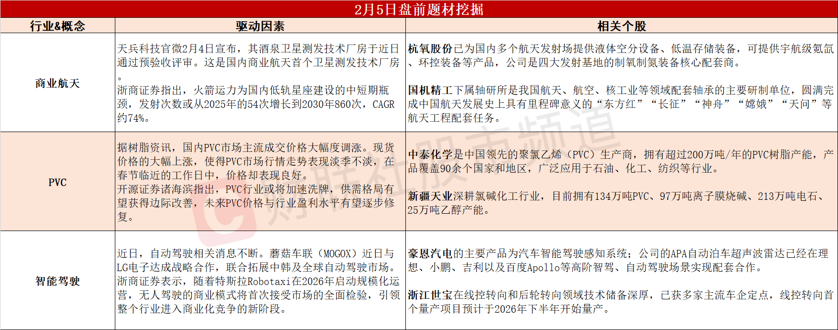 ①商业航天首个卫星测发技术厂房诞生,火箭运力或迎非线性增长。②PVC市场主流成交价格大幅度调涨,行业盈利水平有望逐步修复。③自动驾驶相关催化不断,机构称行业有望进入商业化竞争新阶段。