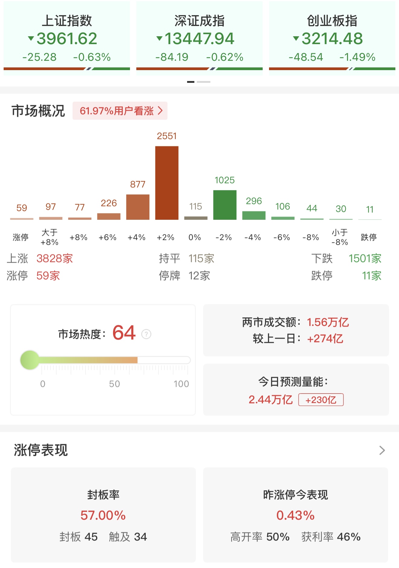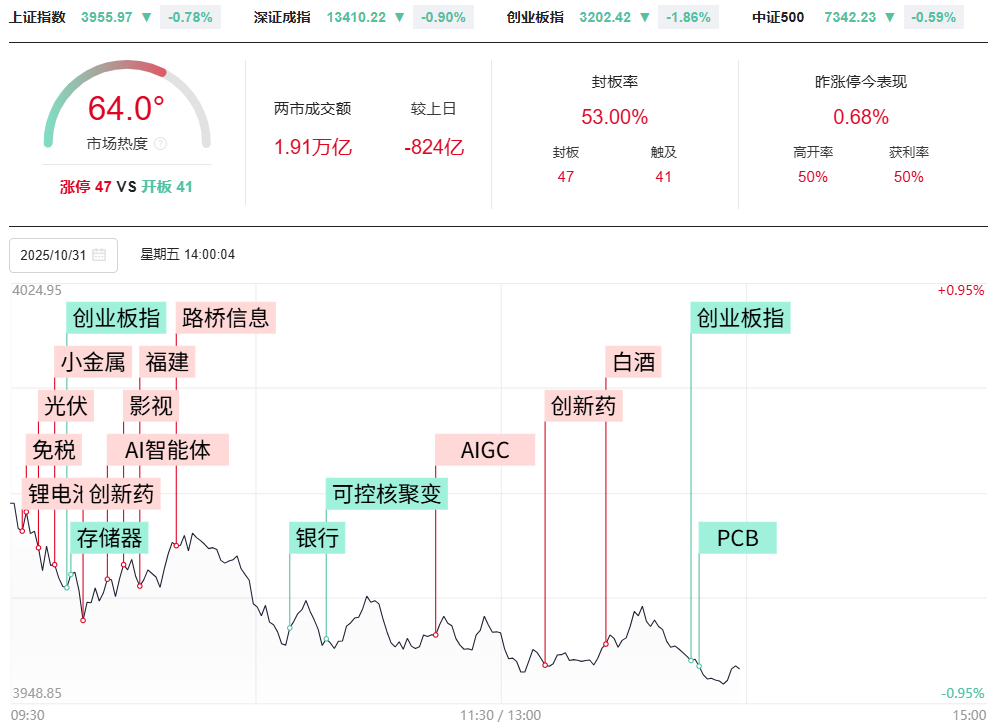 财联社10月31日电,市场早盘市场早间震荡调整,三大指数集体下挫。沪深两市半日成交额1.56万亿,较上个交易日放量274亿。盘面上热点快速轮动,全市场超3800只个股上涨。从板块来看,医药板块逆势上涨,三生国健20cm涨停,联环药业、昂利康涨停。锂电板块表现活跃,天际股份2连板,恩捷股份等多股涨停。福建板块再度走强,平潭发展11天8板。AI应用概念股持续走高,荣信文化、福石控股双双20cm涨停。下跌方面,算力硬件概念股集体下跌,“易中天”光模块三巨头大幅调整。存储芯片概念股震荡走弱,江波龙跌超10%。可控核聚变概念股下挫,中国核建跌停。板块方面,影视院线、医药、电池等板块涨幅居前,保险、存储芯片、煤炭、CPO等板块跌幅居前。截至收盘,沪指跌0.63%,深成指跌0.62%,创业板指跌1.49%。