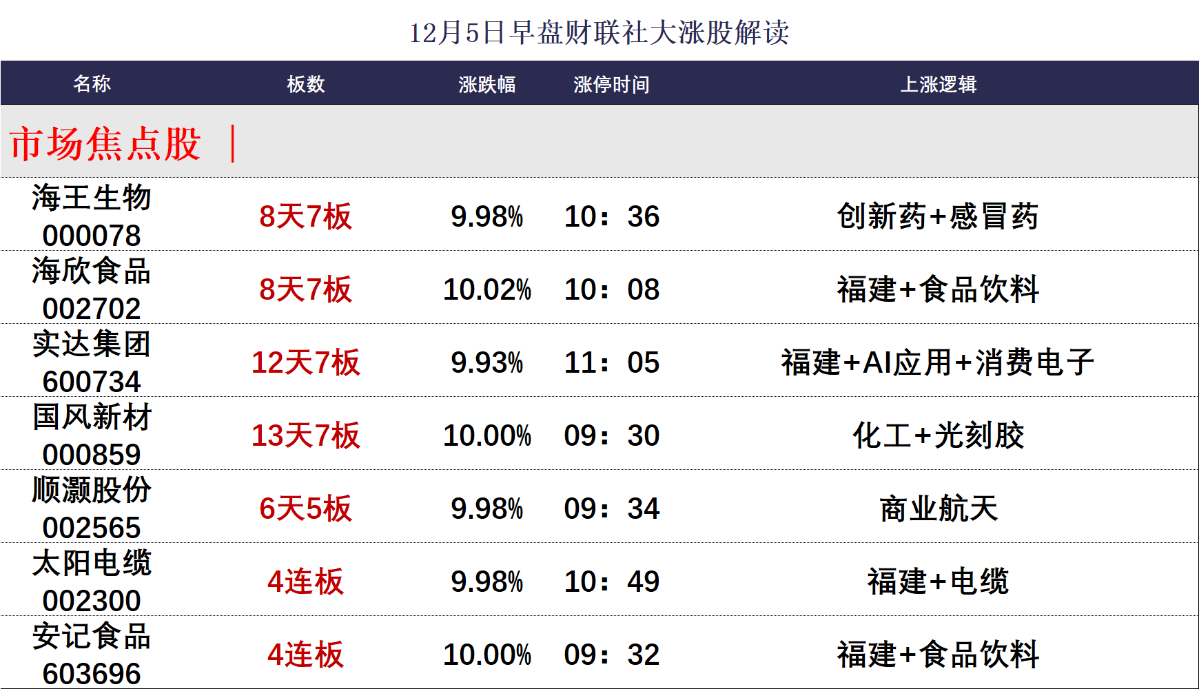 财联社12月5日电,市场早盘探底回升,三大指数集体翻红。沪深两市半日成交额9927亿,较上个交易日缩量394亿。盘面上热点快速轮动,全市场超3500只个股上涨。从板块来看,福建板块持续爆发,海欣食品8天7板,安记食品、太阳电缆双双4连板,舒华体育2连板。算力硬件概念快速走强,长光华芯20cm涨停创历史新高。商业航天概念股延续强势,顺灏股份6天5板,龙洲股份3连板。人形机器人概念表现活跃,骏亚科技3连板,中坚科技涨停。下跌方面,银行板块震荡走弱,重庆银行跌超3%。板块方面,贵金属、算力硬件、福建等板块涨幅居前,银行、房地产、医药等板块跌幅居前。截至收盘,沪指涨0.08%,深成指涨0.39%,创业板指涨0.47%。