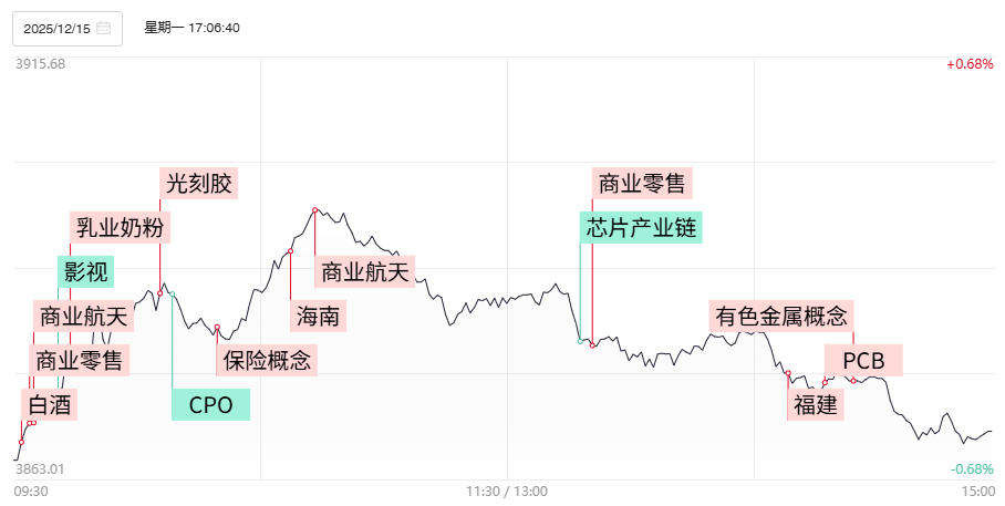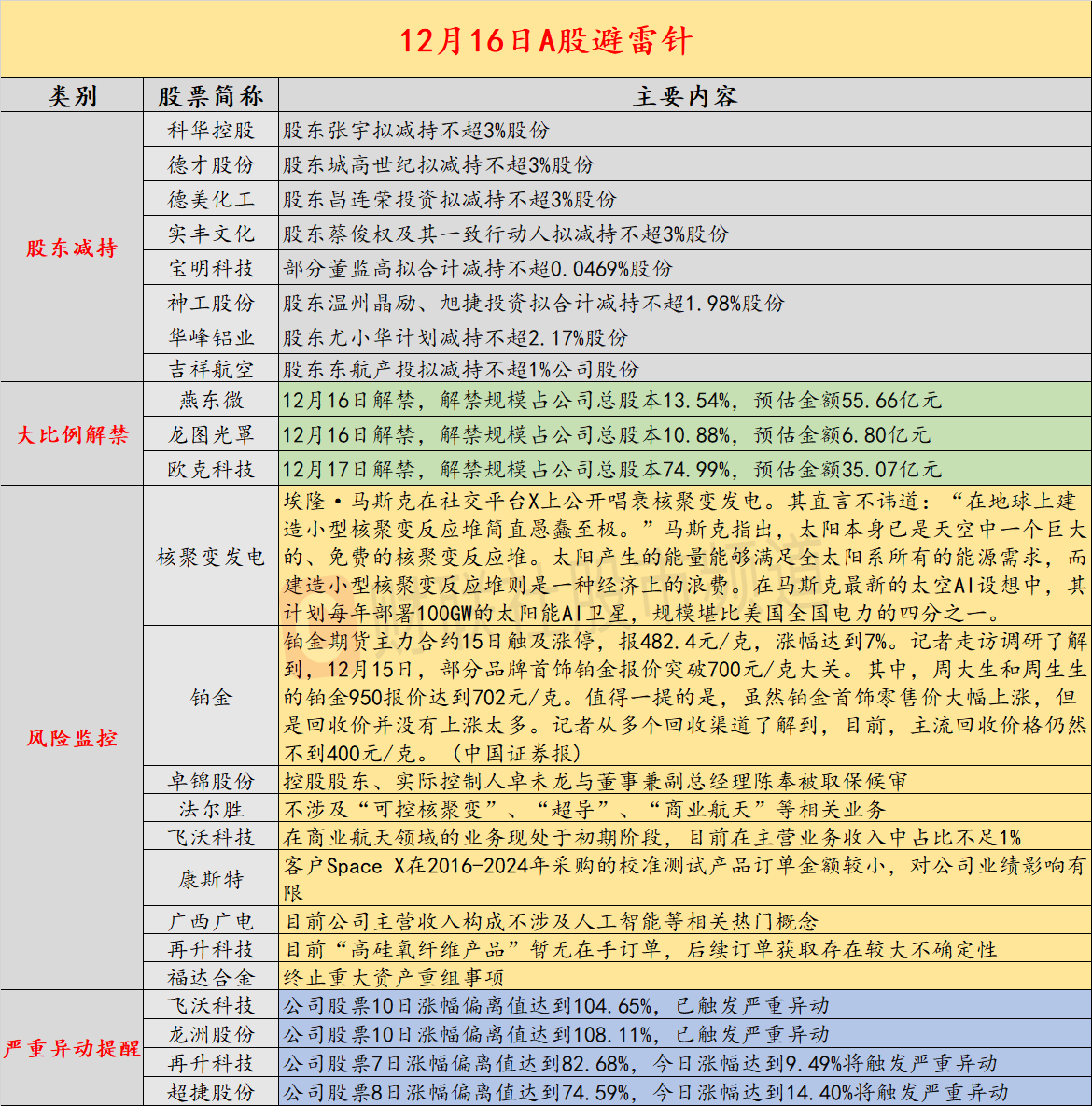 财联社12月16日电,上个交易日市场震荡调整,沪指盘中翻红后再度回落,创业板指低开低走。全市场超2900只个股下跌。沪深两市成交额1.77万亿,较上周五缩量3188亿。1)据报道,SpaceX确认正在为2026年进行潜在IPO做准备,内部股票定价为每股421美元,使SpaceX估值约为8000亿美元。商业航天概念延续上周强势,再升科技实现5进6,但盘中经历多次炸板,华菱线缆、中超控股、长城电工全天封死一字涨停,科强股份、昇辉科技等低位补涨股继续涌现。2)高工产业研究院12月10日发布的《2025年中国AIDC储能行业发展蓝皮书》显示,全球AIDC储能市场正迎来爆发式增长,储能概念全天表现可圈可点,叠加钙钛矿电池概念的东方日升录得20厘米涨停,逆变器概念固德威涨超10%,艾罗能源、德业股份、上能电气等一度冲高。3)上周末商务部、央行、金融监管总局联合印发《关于加强商务和金融协同更大力度提振消费的通知》,零售板块结束上周五调整展开强修复,百大集团连续两日走出弱转强晋级3连板,广百股份、红旗连锁两只低位股反包涨停。不过随着指数尾盘回落,东百集团、新世界、中央商场等多股出现炸板迹象。4)世界半导体贸易统计组织最新预测显示,2025年全球半导体营收有望同比增长22.5%至7720亿美元,2026年将再增长26.3%,达9750亿美元。光刻胶概念盘中逆势拉升,艾森股份录得20厘米涨停,南大光电、恒坤新材涨超10%,彤程新材一度逼近涨停。