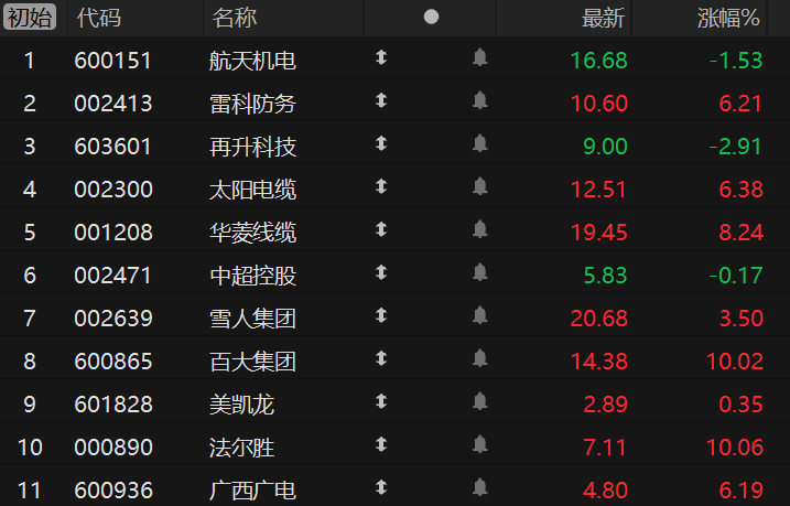 财联社12月16日电,市场焦点股航天机电(12天7板)低开1.53%,商业航天概念股雷科防务(16天8板)高开6.21%、再升科技(6板)低开2.91%,线缆概念股太阳电缆(10天6板)高开6.38%、华菱线缆(3板)高开8.24%,可控核聚变概念股中超控股(3板)低开0.17%、雪人集团(3板)高开3.50%,零售板块百大集团(3板)竞价涨停、美凯龙(5天3板)高开0.35%,光纤光缆概念股法尔胜(3板)竞价涨停,拟更名的广西广电(3板)高开6.19%。