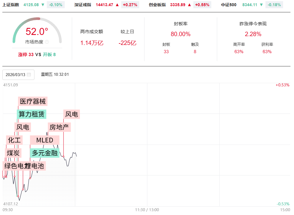 财联社3月13日电,市场早盘冲高回落,三大指数再度集体翻绿,而微盘股指数涨超1%。沪深两市半日成交额1.51万亿,较上个交易日缩量884亿。盘面上热点快速轮动,部分题材反复走强,全市场超2900只个股上涨。从板块来看,化工板块延续强势,潞化科技、金煤科技双双2连板,金正大、红宝丽、泸天化等多股涨停。风电板块反复活跃,通裕重工20CM涨停,天顺风能、远程股份涨停。电池材料概念快速走高,负极、电解液方向领涨,璞泰来涨停。下跌方面,算力租赁概念集体退潮,美利云跌停,优刻得、云天励飞等多股大跌。截至收盘,沪指跌0.22%,深成指跌0.17%,创业板指跌0.03%。