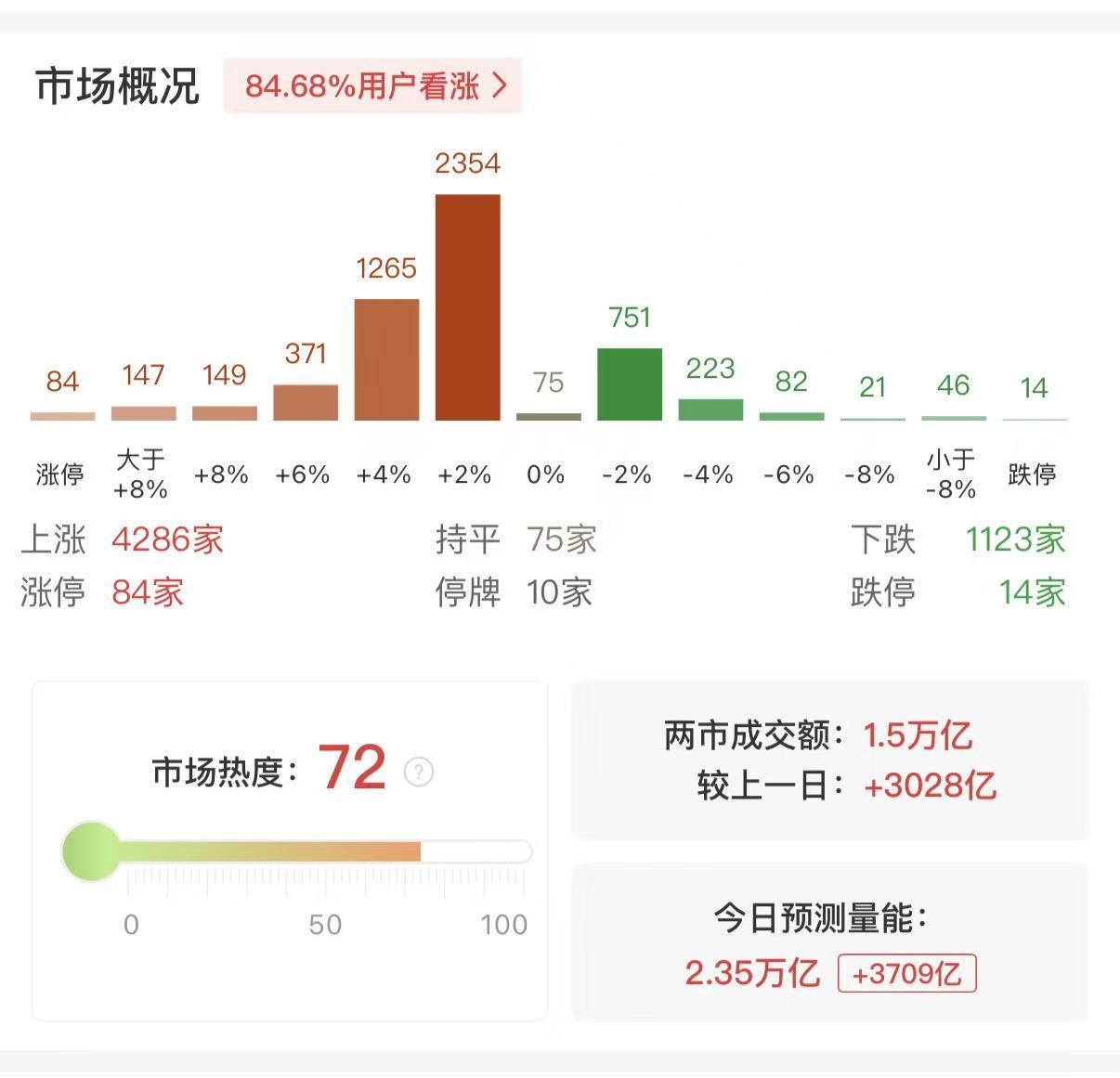 财联社2月24日电,市场早盘高开回落,随后又震荡回升,三大指数均涨超1%。沪深两市半日成交额1.51万亿,较上个交易日放量3065亿。盘面上热点快速轮动,全市场超4200只个股上涨。从板块来看,油气股集体大涨,准油股份、山东墨龙、洲际油气、中曼石油等多股涨停。化工板块爆发,美邦股份4连板,金牛化工7天4板,澄星股份、金浦钛业涨停。玻纤概念反复活跃,国际复材涨超4天2板,续创历史新高。贵金属概念走高,湖南白银封涨停。下跌方面,影视院线概念集体大跌,横店影视、博纳影业、中国电影跌停。截至收盘,沪指涨1.17%,深成指涨1.82%,创业板指涨1.76%。