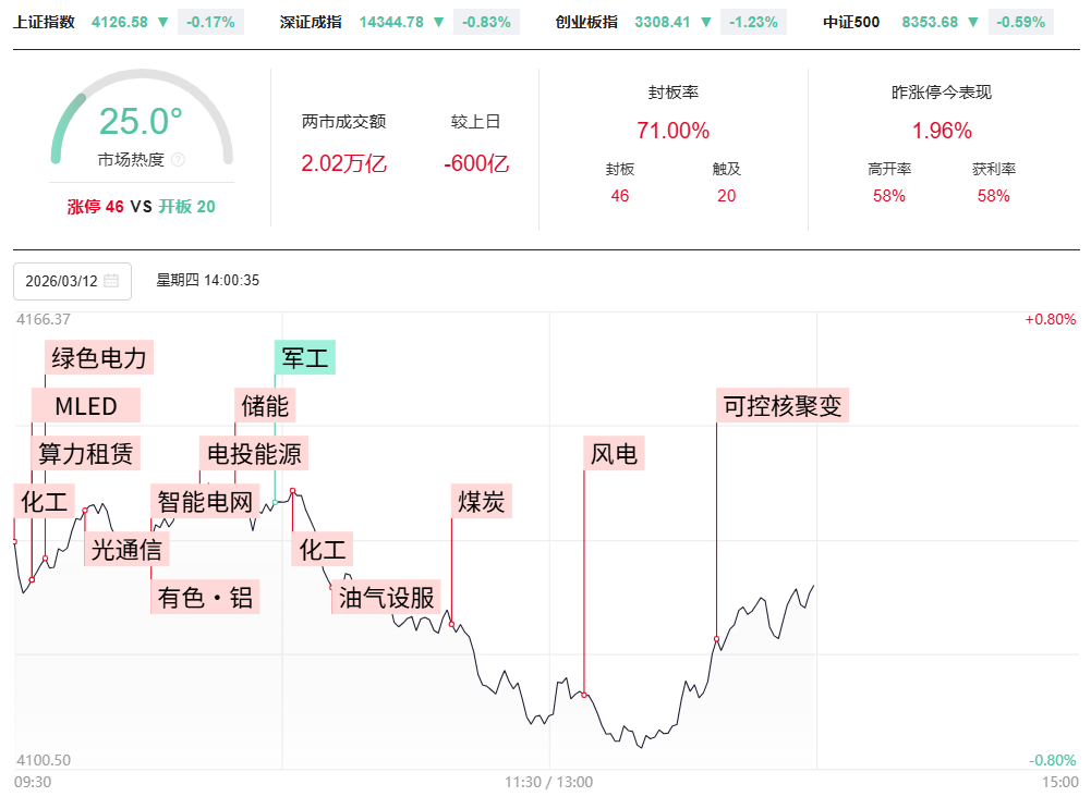 财联社3月12日电,市场探底回升,午后三大指数跌幅收窄。沪深两市成交额2.44万亿,较上一个交易日缩量665亿。盘面上,局部热点反复走强,全市场近3900只个股下跌。从板块来看,绿电概念爆发,绿发电力、华电能源3连板,协鑫能科、大唐发电、金开新能等多股涨停。化工板块持续走强,十余只成分股涨停,金牛化工走出9天5板,潞化科技、三房巷、和邦生物涨停。煤炭板块表现活跃,兖矿能源、郑州煤电涨停,中煤能源创18年新高。碳纤维概念延续强势,中复神鹰、吉林化纤涨停。下跌方面,燃气轮机概念连续调整,博盈特焊、海联讯大跌。军工板块走弱,航亚科技等多股下挫。截至收盘,沪指跌0.1%,深成指跌0.63%,创业板指跌0.96%。