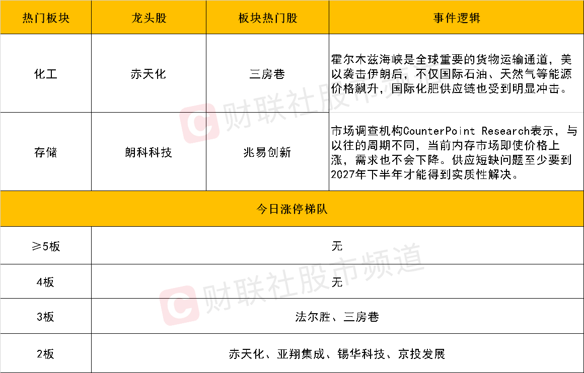 市场探底回升,深成指午后翻红,创业板指涨超1%。成交量方面,第一个小时两市放量564亿,预计两市全天成交2.36万亿。整体情绪有所回暖,热点快速轮动,存储芯片方向持续走强,兆易创新涨停。港口航运回暖,招商南油涨停。短线方面,短线情绪延续分化,吉林化纤、金浦钛业、泸天化、赤天化冲板回落,金牛化工反复开板,高位股中南文化跌停。