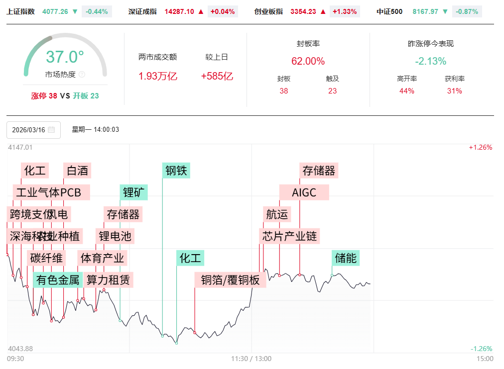 财联社3月16日电,市场探底回升,深成指收红,创业板指涨超1%。沪深两市成交额2.33万亿,较上一个交易日缩量750亿。盘面上,市场热点快速轮动,全市场超2800只个股上涨。从板块来看,存储芯片概念集体爆发,佰维存储涨超12%续创历史新高,兆易创新、金太阳、朗科科技、盈新发展涨停。深海科技概念走强,东方海洋、神开股份、海洋王涨停。PCB概念表现活跃,金安国纪、超颖电子、卓郎智能涨停。航运板块午后走高,招商南油、海航科技涨停。下跌方面,储能、绿电概念持续调整,中国核建、中国电建触及跌停。煤炭板块下挫,郑州煤电大跌。截至收盘,沪指跌0.26%,深成指涨0.19%,创业板指涨1.41%。
