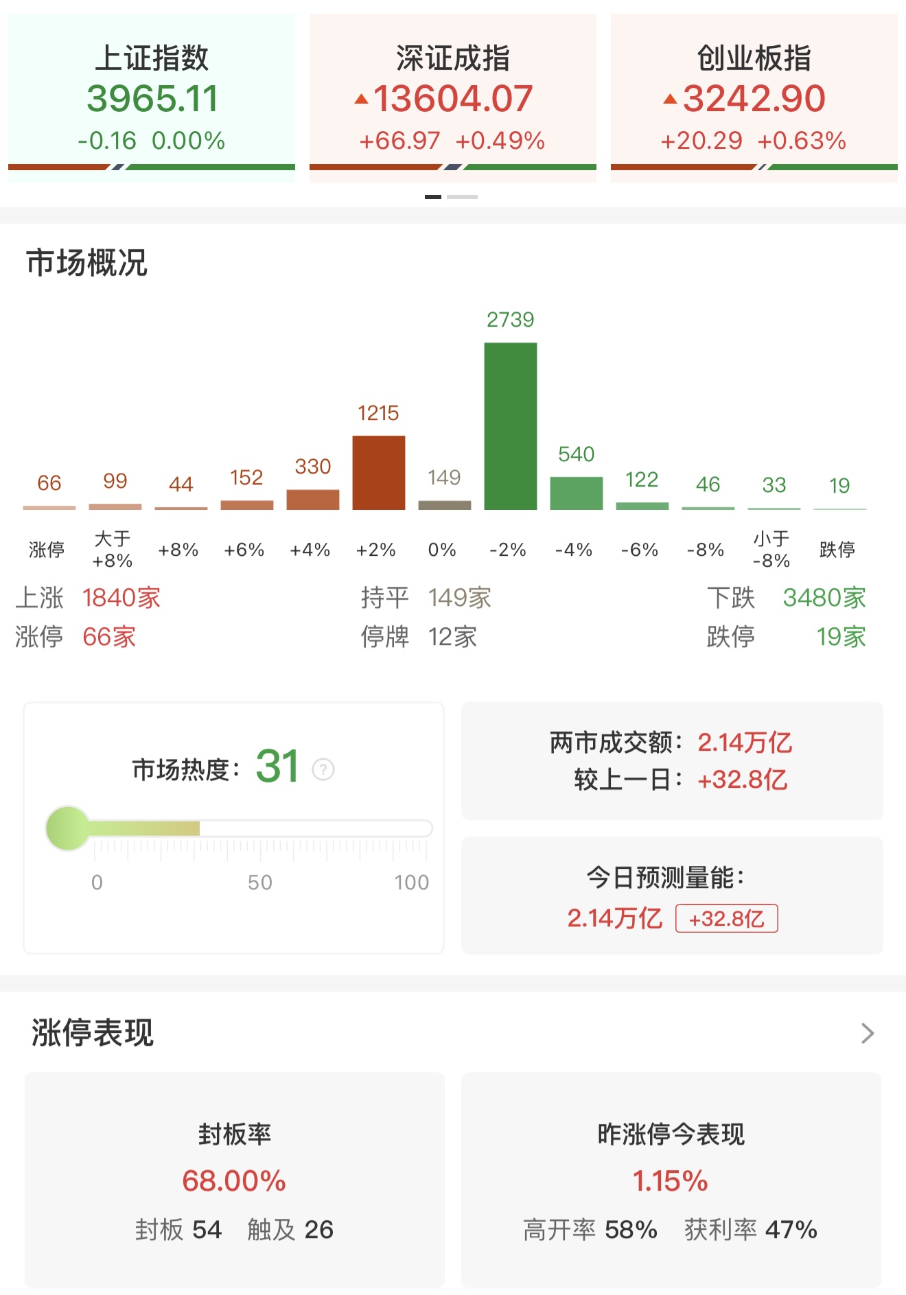 市场午后震荡拉升,沪指、创业板指盘中再度翻红。成交量方面,第一个小时两市放量1139亿,预计两市全天成交2.14万亿。热点延续轮动,人形机器人概念持续走强,万向钱潮、三花智控午后涨停,长盈精密涨超14%创历史新高。短线情绪分化,连板股晋级率为三成,商业航天概念股跳水,神剑股份跌停,鲁信创投炸板翻绿,中国卫星冲高回落。