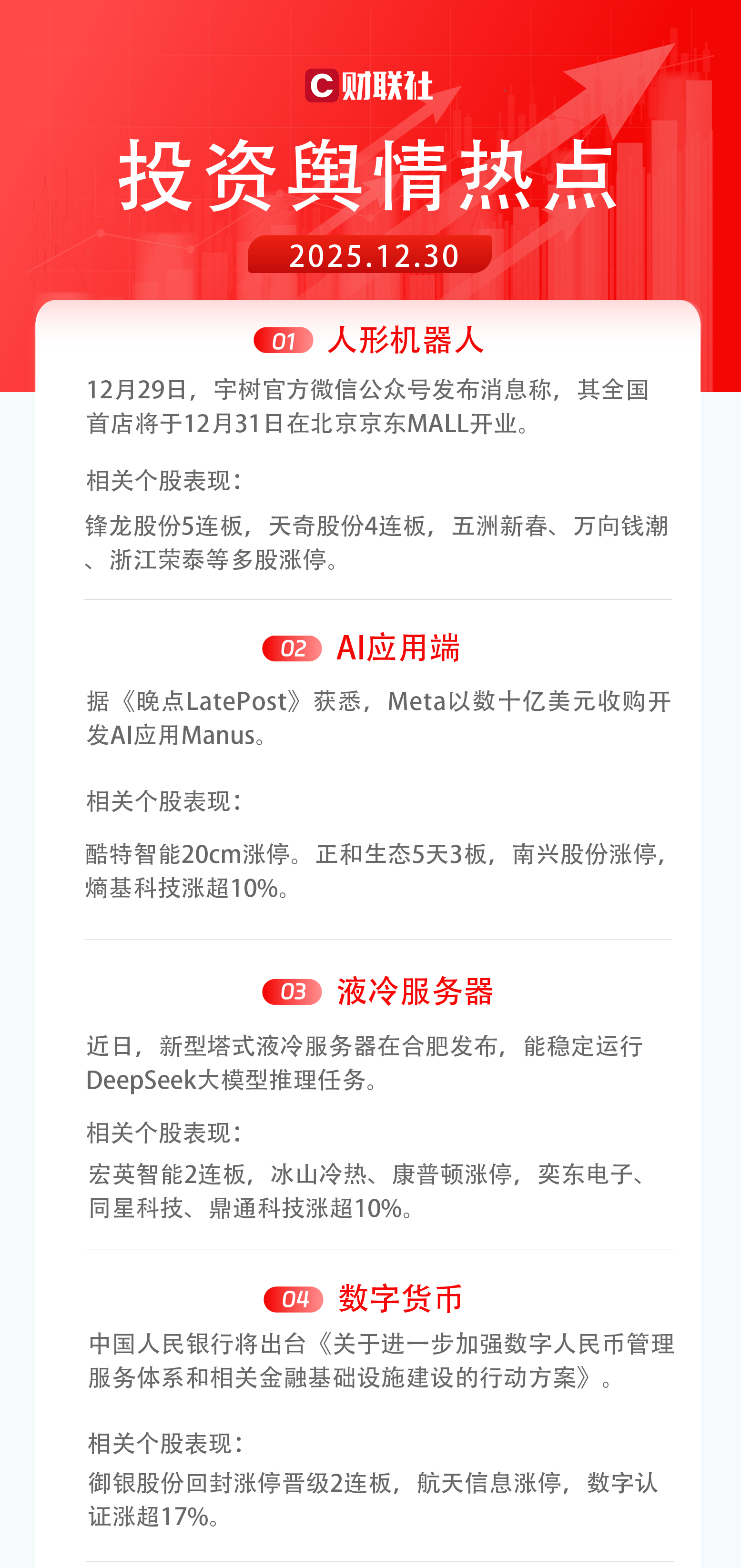 1)人形机器人:12月29日,宇树官方微信公众号发布消息称,其全国首店将于12月31日在北京京东MALL开业。