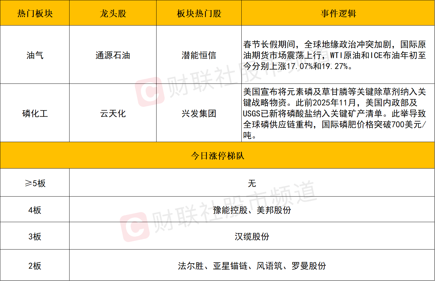 财联社2月24日电,午后磷化工板块涨势扩大,云天化、六国化工、湖北宜化、云图控股涨停,川金诺涨超10%,兴发集团触及涨停,江山股份、司尔特、川恒股份、清水源等涨幅靠前。消息面上,美国宣布将元素磷及草甘膦等关键除草剂纳入关键战略物资。此前2025年11月,美国内政部及USGS已新将磷酸盐纳入关键矿产清单。此举导致全球磷供应链重构,国际磷肥价格突破700美元/吨。