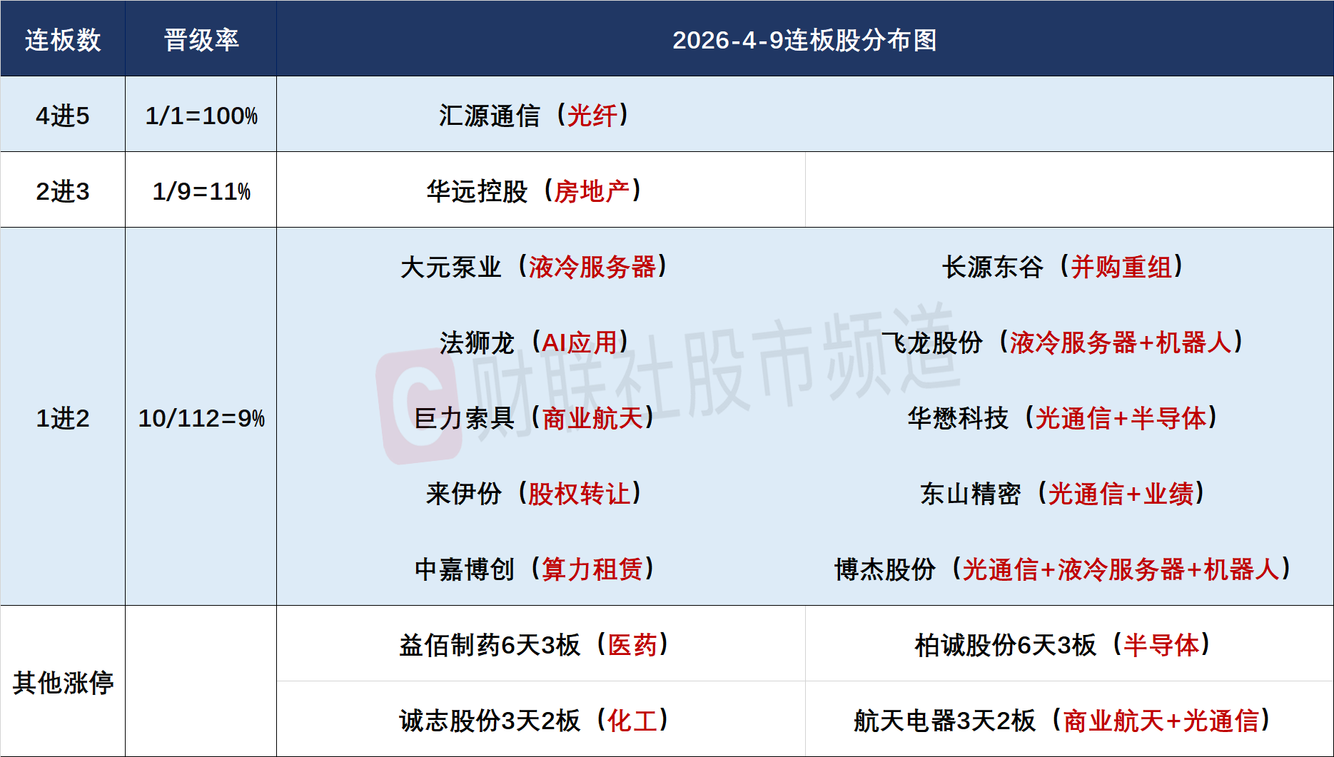 4月9日连板股分析:连板股晋级率不足二成 光模块+光纤强者恒强
