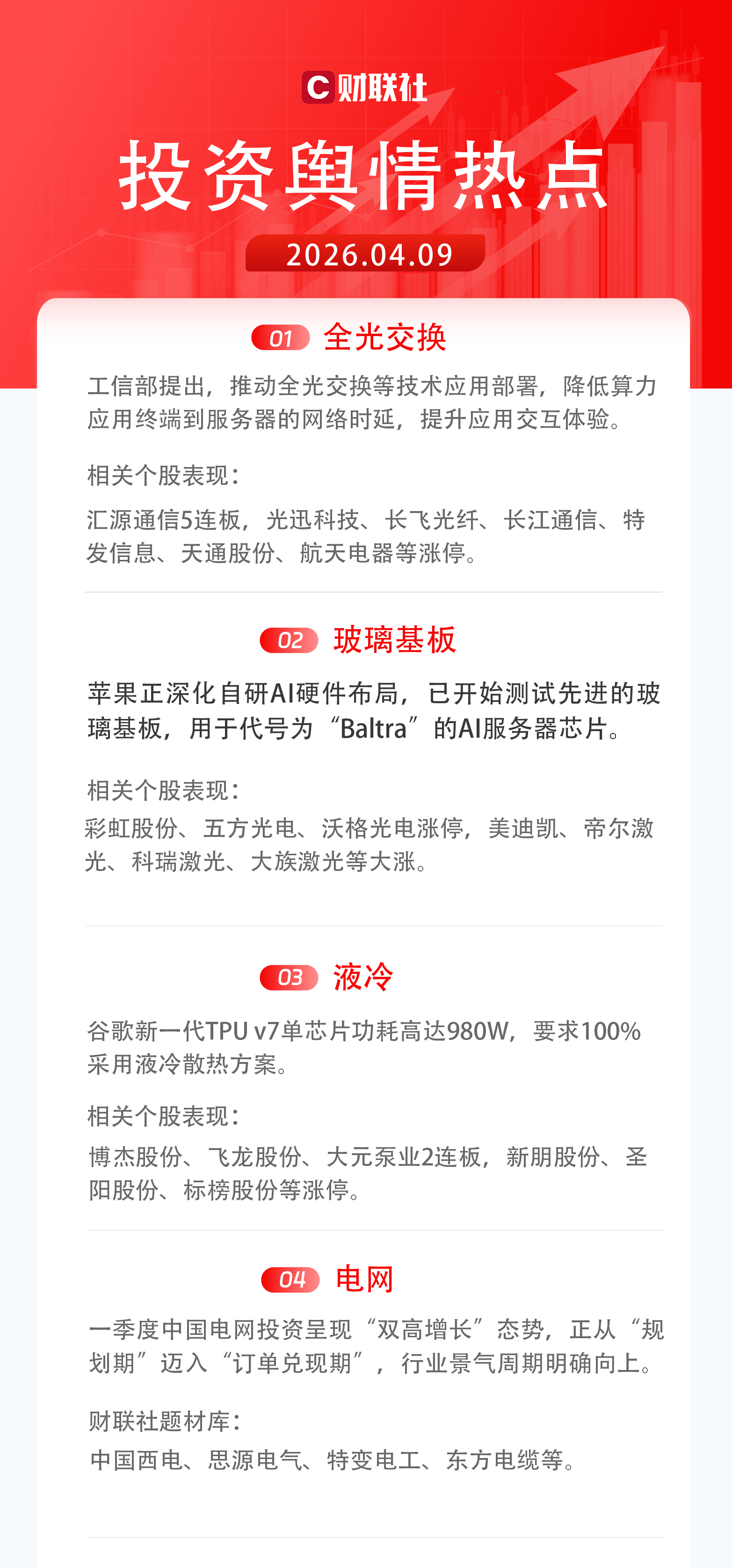 财联社4月9日电,市场全天震荡调整,沪指、创业板指均跌超0.5%。沪深两市成交额2.13万亿,较上一个交易日缩量3004亿。盘面上,市场热点较为杂乱,全市场超4200只个股下跌。从板块来看,算力硬件方向反复活跃,其中光纤概念快速走高,特发信息涨停创历史新高,汇源通信回封涨停走出5连板。CPO概念再度走强,东山精密走出2连板,续创历史新高。液冷服务器概念震荡拉升,飞龙股份、博杰股份、大元泵业2连板。半导体设备概念表现活跃,柏诚股份6天3板,亚翔集成涨停。下跌方面,医药商业概念集体调整,合富中国、人民同泰纷纷下挫。截至收盘,沪指跌0.72%,深成指跌0.33%,创业板指跌0.73%。