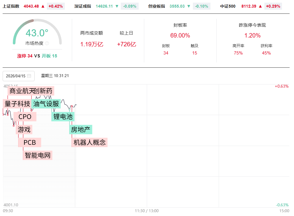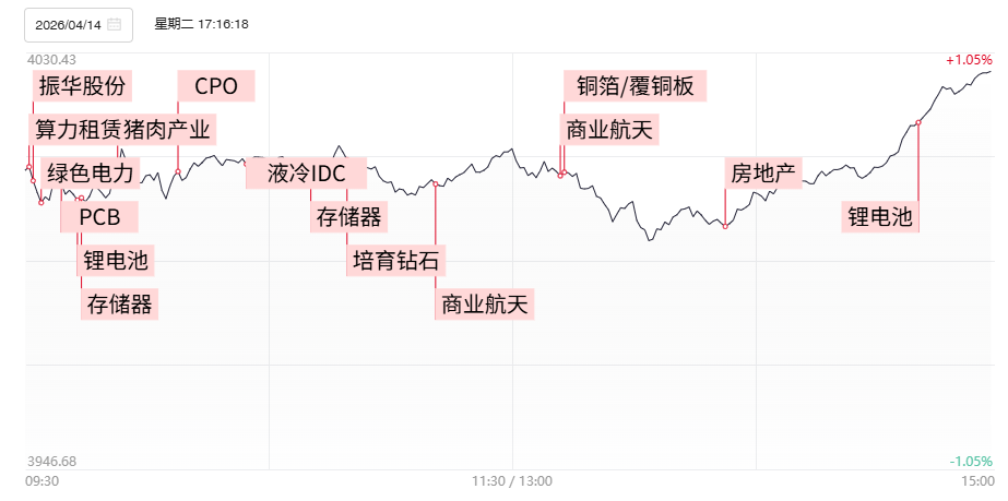 财联社4月15日电,上个交易日市场震荡反弹,创业板指涨超2%,续创阶段新高,沪指涨近1%重返4000点,深成指涨超1.5%。全市场超3700只个股上涨。沪深两市成交额2.38万亿,较前日放量2334亿。1)近期产业信息显示,北美四大云厂商DCI招标计划已明确,2026年将成为DCI投资的“超级周期。算力硬件产业链热度居高不下,光芯片概念小市值人气股华盛昌走出11天5板,长光华芯涨超10%,均创历史新高。而CCL产业链的涨价潮继续向整个AI PCB产业链蔓延,沪电股份、宏昌电子、宏和科技、大族激光触及涨停续创历史新高。2)SemiAnalysis 数据显示,算力租赁价格呈现上涨趋势,算力租赁产业链近期持续升温,预告一季报净利润同比增284%的协创数据开盘后不久即封死20厘米涨停,趋势抱团核心宏景科技、利通电子双双实现向上反包,前日断板跌停的中嘉博创实现反包板。3)受益国内新型储能容量电价补偿政策鼓励,以及海外AI算力基建以及能源安全战略的多重驱动,储能电池呈现供需双旺,锂电产业链再掀高潮,石大胜华、腾远钴业在超预期的一季报业绩刺激下双双封涨停,带动所属的电解液、正极材料方向全天强势领涨,海科新源封20厘米涨停创历史新高,孚日股份、湖南裕能、天际股份、多氟多等位居涨幅前列。4)SpaceX上市正式进入倒计时,商业航天概念重拾升势,人气股航天长峰、西部材料涨停,震有科技、信科移动、新雷能等多股涨逾10%。
