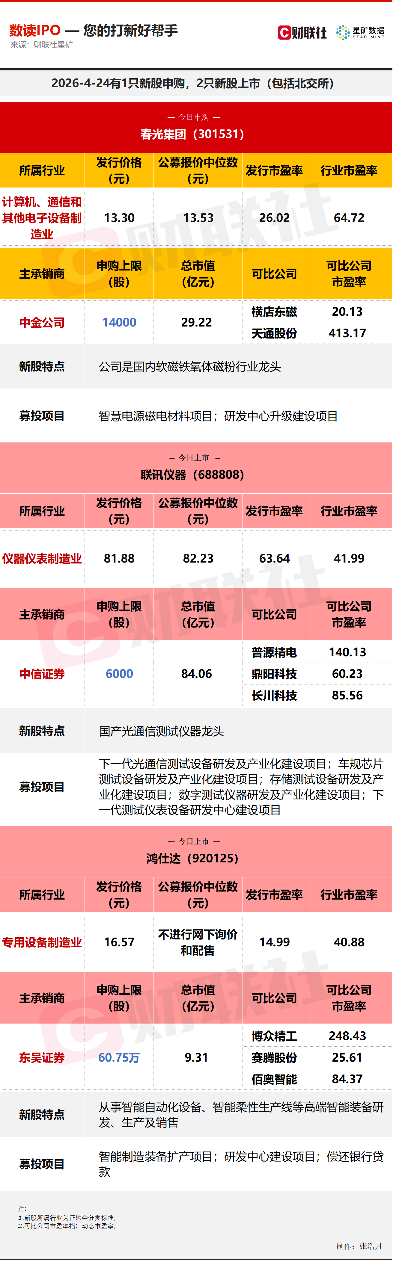 财联社4月24日电,今日有1只新股申购,为创业板的春光集团;2只新股上市,分别为为科创板的联讯仪器,北交所的鸿仕达。
