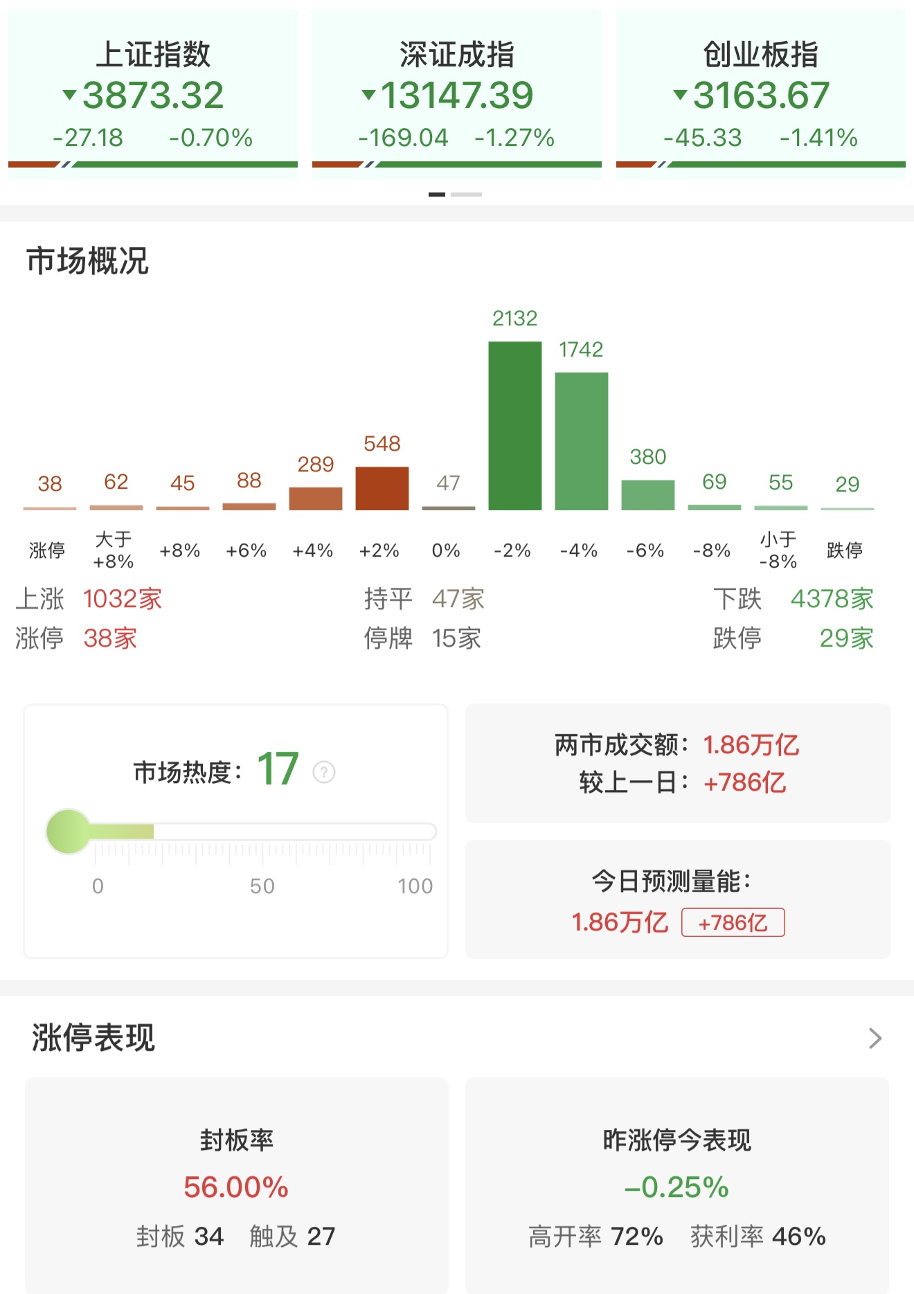 今日共56股涨停,连板股总数16只,其中三连板及以上个股8只,上一交易日共17只连板股,连板股晋级率47.05%(不含ST股、退市股)。个股方面,高位股负反馈开始显现,海欣食品、骏亚科技跌停,航天发展跌超6%。此外,安记食品、舒华体育、昇兴股份、南京商旅均炸板翻绿,亏钱效应同样显著。龙洲股份虽然将市场连板高度维持在6板,但是盘中多次炸板,放量分歧。板块方面,算力硬件股探底回升,中瓷电子3连板,跃岭股份2连板,特发信息4天2板,权重新易盛午后一度涨近5%再创历史新高;房地产板块午后异动拉升,万科A涨停,港股万科企业盘中一度暴涨超18%,世联行、财信发展、南都物业、华夏幸福等个股涨停。