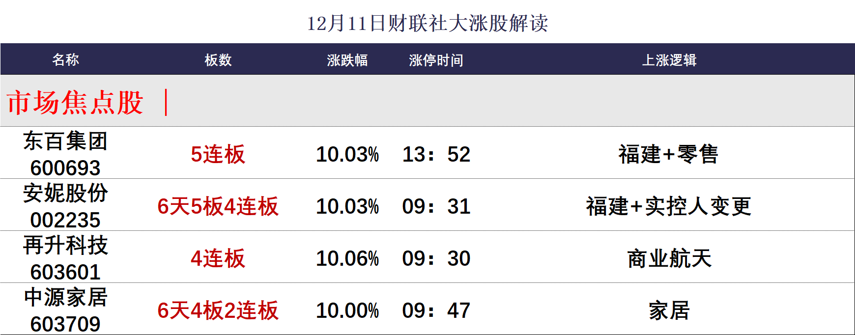 财联社12月10日电,今日全市场共56股涨停,连板股总数16只,28股封板未遂,封板率为67%(不含ST股、退市股)。焦点股方面,零售板块茂业商业12天7板、东百集团4连板,福建本地股龙洲股份6连板、厦门港务4连板、安妮股份5天4板。
