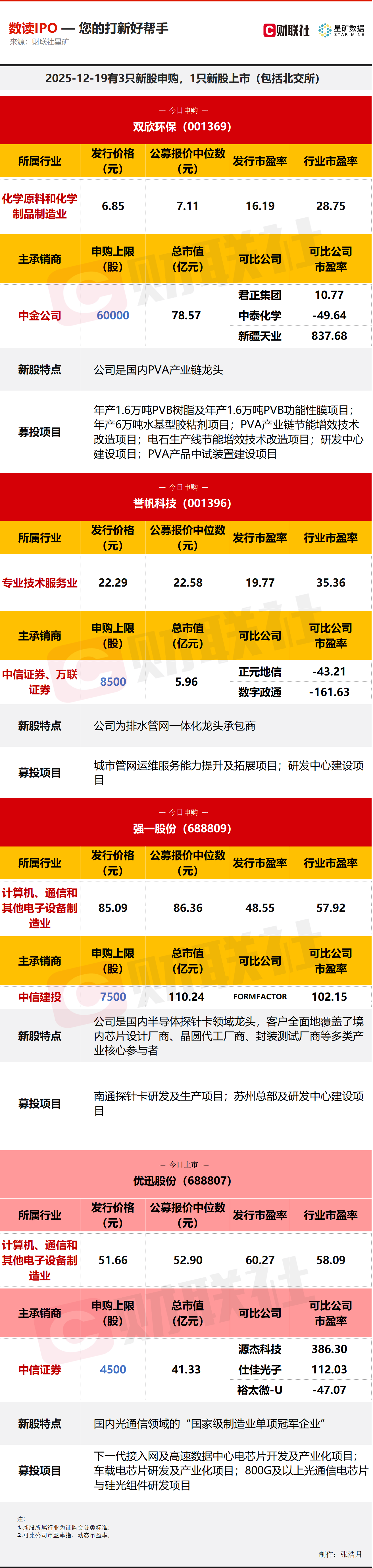 财联社12月19日电,今日有3只新股申购,分别为深交所的双欣环保、誉帆科技,科创板的强一股份;1只新股上市,为科创板的优迅股份。