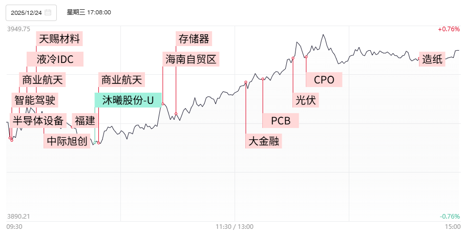 财联社12月25日电,市场早盘走势分化,三大指数涨跌不一,沪指震荡拉升,创业板指冲高回落。沪深两市半日成交额1.2万亿,较上个交易日放量509亿。盘面上热点快速轮动,全市场超3200只个股上涨。从板块来看,商业航天概念反复活跃,神剑股份晋级6连板,九鼎新材3连板,隆基机械等十余股涨停。机器人概念走强,万向钱潮、旭升集团等多股涨停。造纸概念爆发,博汇纸业、宜宾纸业、五洲特纸涨停。数字货币概念拉升,证通电子、金时科技涨停。下跌方面,贵金属概念跌幅居前,浩通科技跌超8%。海南自贸概念下挫,海南瑞泽、凯撒旅业走弱。截至收盘,沪指涨0.29%,深成指跌0.11%,创业板指跌0.37%。