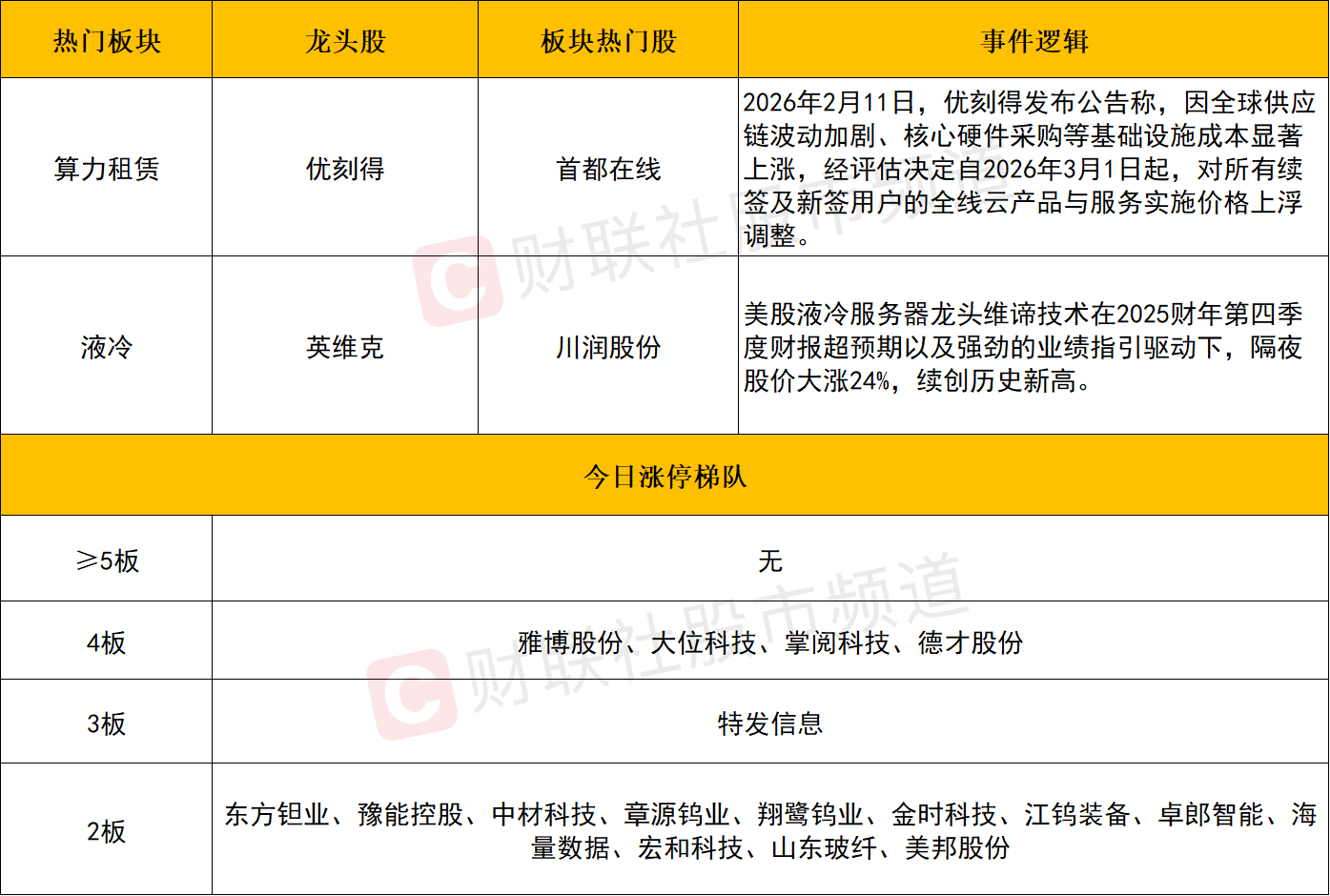 今日赚钱效应集中在算力链方向,其中算力租赁受涨价逻辑催化涨幅居前,大位科技4连板,优刻得、首都在线双双20CM涨停,趋势中军网宿科技延续涨势,液冷概念同样走强,英维克、川润股份、博杰股份等涨停。CPO方向反复活跃,天孚通信、罗博特科、太辰光等个股续创历史新高。随着近期AI方向再迎密集催化,算力仍是未来景气度作为明确的赛道方向之一。