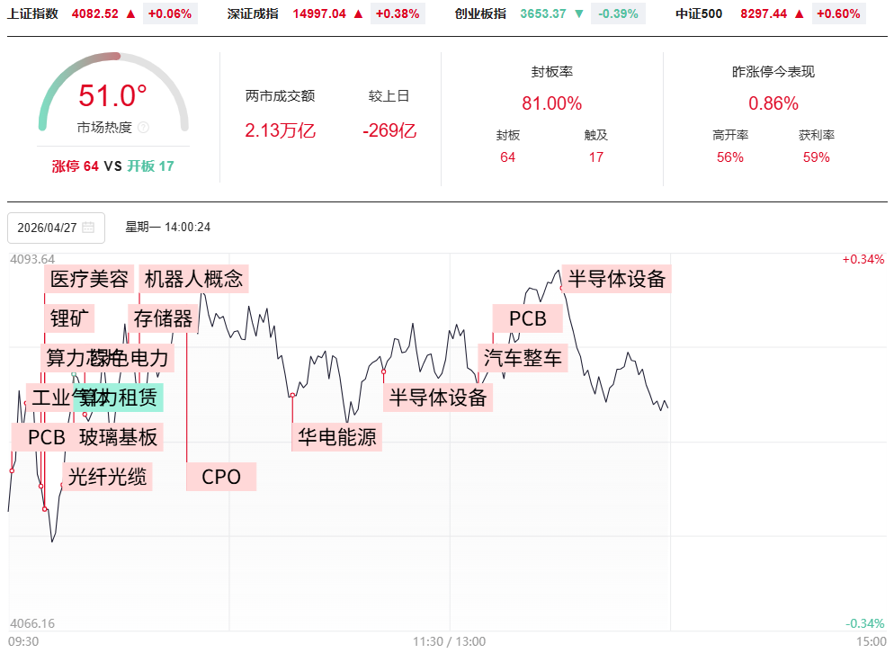 财联社4月27日电,市场早盘窄幅震荡,三大指数涨跌不一,科创50指数涨超3%。创业板指黄白两线分化,中小盘股表现稍强。沪深两市半日成交额1.7万亿,较上个交易日缩量287亿。盘面上热点快速轮动,全市场近2800只个股下跌。从板块来看,算力硬件方向走强,其中PCB概念反复活跃,深南电路大涨续创历史新高,方邦股份、山东玻纤、景旺电子均涨停。CPO概念盘中再度活跃,立讯精密创历史新高,铭普光磁涨停。光纤概念表现活跃,中天科技涨停,续创历史新高。算力芯片概念震荡拉升,东芯股份涨超10%,摩尔线程、芯原股份、澜起科技大涨。下跌方面,算力租赁概念表现较弱,杭钢股份跌停,浙数文化触及跌停,网宿科技、并行科技、宏景科技纷纷下挫。截至收盘,沪指涨0.15%,深成指涨0.52%,创业板指跌0.2%。