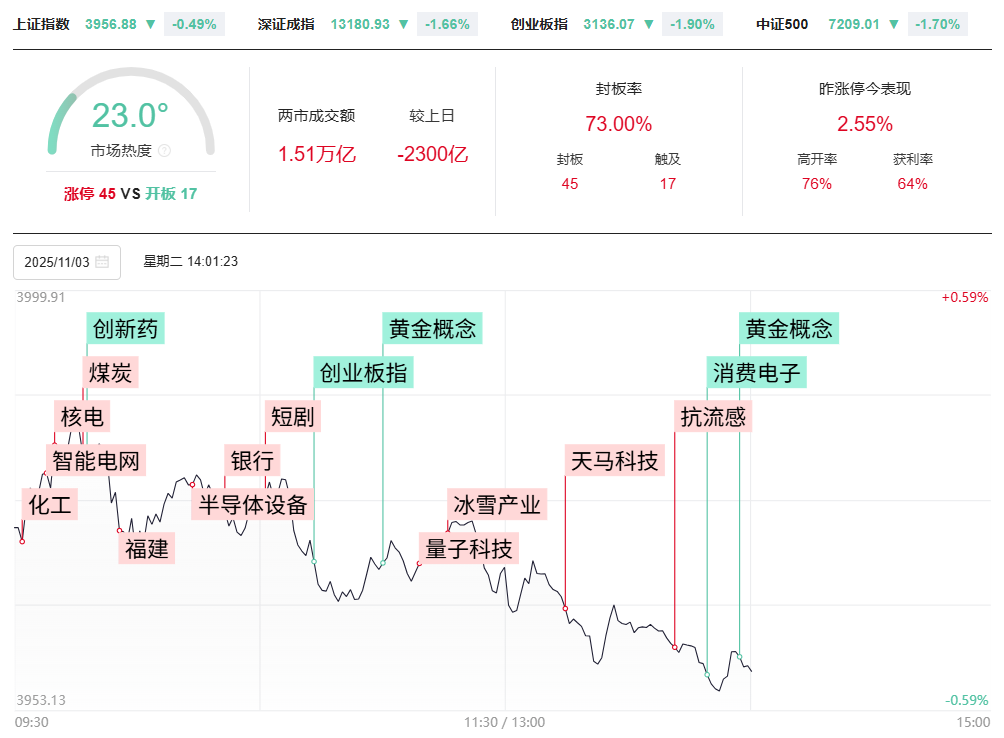 财联社11月4日电,市场全天缩量调整,创业板指跌近2%。量能继续萎缩,沪深两市成交额不足2万亿,较上一个交易日缩量1914亿。盘面上,市场热点较为杂乱,全市场超3600只个股下跌。从板块来看,福建板块逆势上扬,平潭发展13天10板,福建金森等10股涨停。核电板块反复活跃,其中钍基熔盐堆概念表现较强,兰石重装4天3板。煤炭板块再度走强,安泰集团14天8板。“马字辈”股逆势活跃,天马科技等多股涨停。下跌方面,创新药概念震荡调整,常山药业跌停。贵金属概念股集体下挫,国城矿业跌停。板块方面,福建自贸区、银行、冰雪产业等板块涨幅居前,贵金属、医药、机器人等板块跌幅居前。截至收盘,沪指跌0.41%,深成指跌1.71%,创业板指跌1.96%。