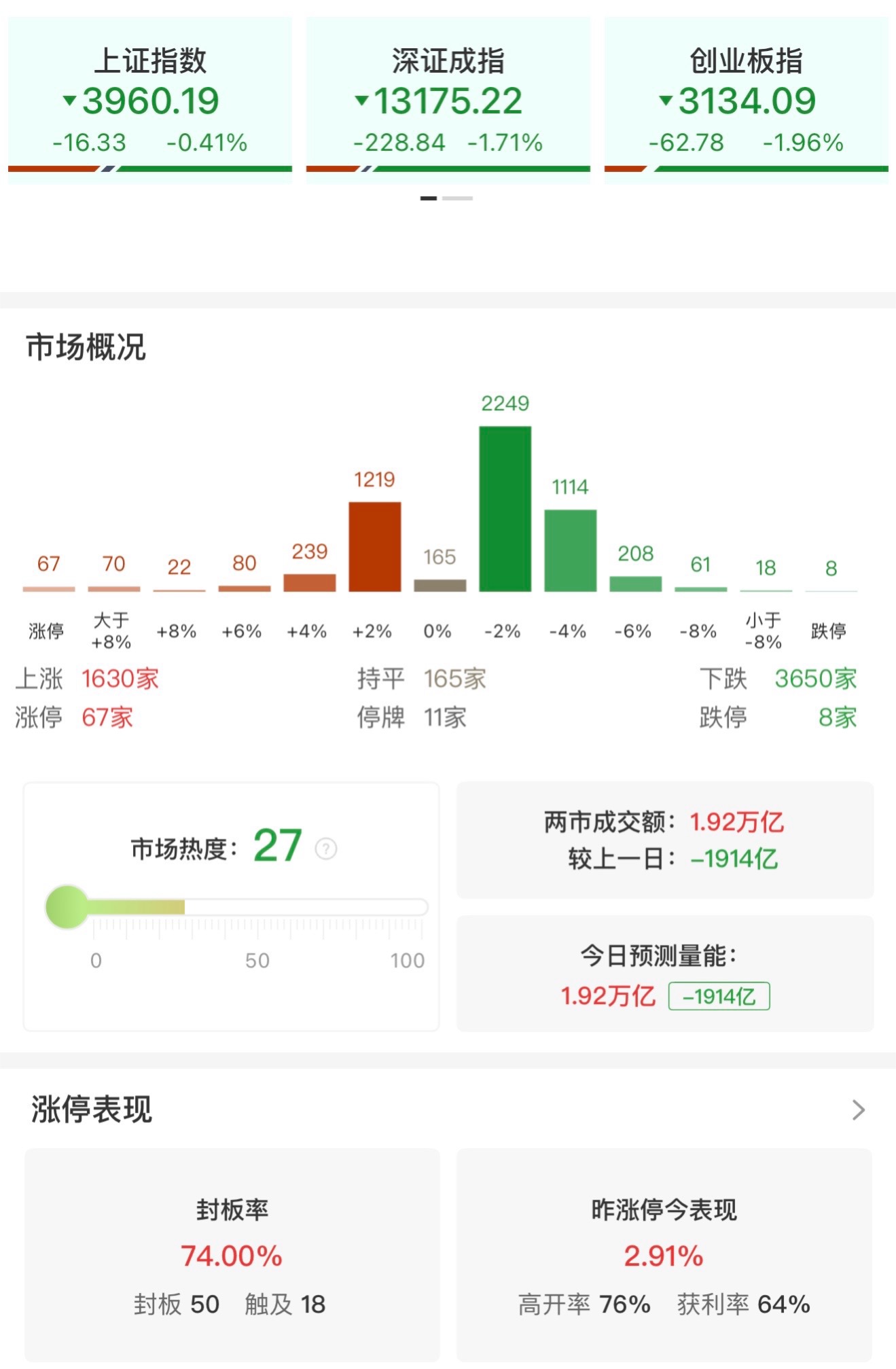 收评:创业板指低开低走跌近2% 两市成交额萎缩近2000亿