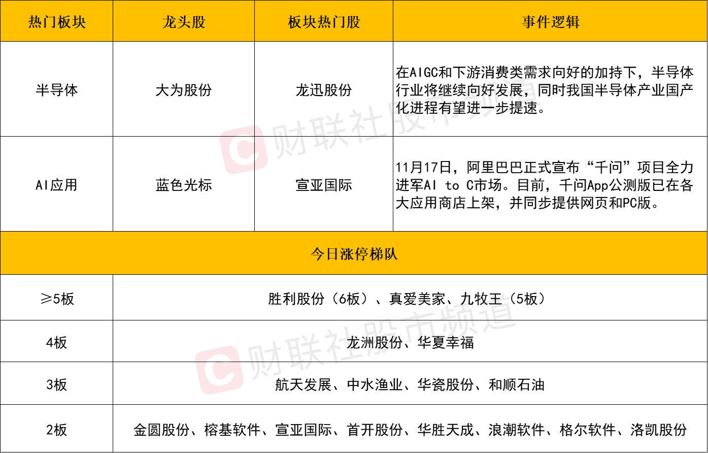 财联社11月18日电,市场早盘震荡调整,深成指、创业板指翻红后再度回落。沪深两市半日成交额1.28万亿,较上个交易日放量166亿。盘面上热点较为杂乱,全市场超4000只个股下跌。从板块来看,AI应用概念大涨,榕基软件、浪潮软件2连板,宣亚国际等10余股涨停。半导体概念表现活跃,同益股份20cm涨停,龙迅股份涨停。机器人概念股局部走强,首开股份5天3板。下跌方面,福建、锂电池等热门板块集体下挫。其中福建板块重挫,福建金森、福建水泥等多股跌停。锂电池板块震荡走弱,石大胜华跌停。板块方面,AI应用、半导体等板块涨幅居前,煤炭、电池、钢铁等板块跌幅居前。截至收盘,沪指跌0.56%,深成指跌0.43%,创业板指跌0.43%。
