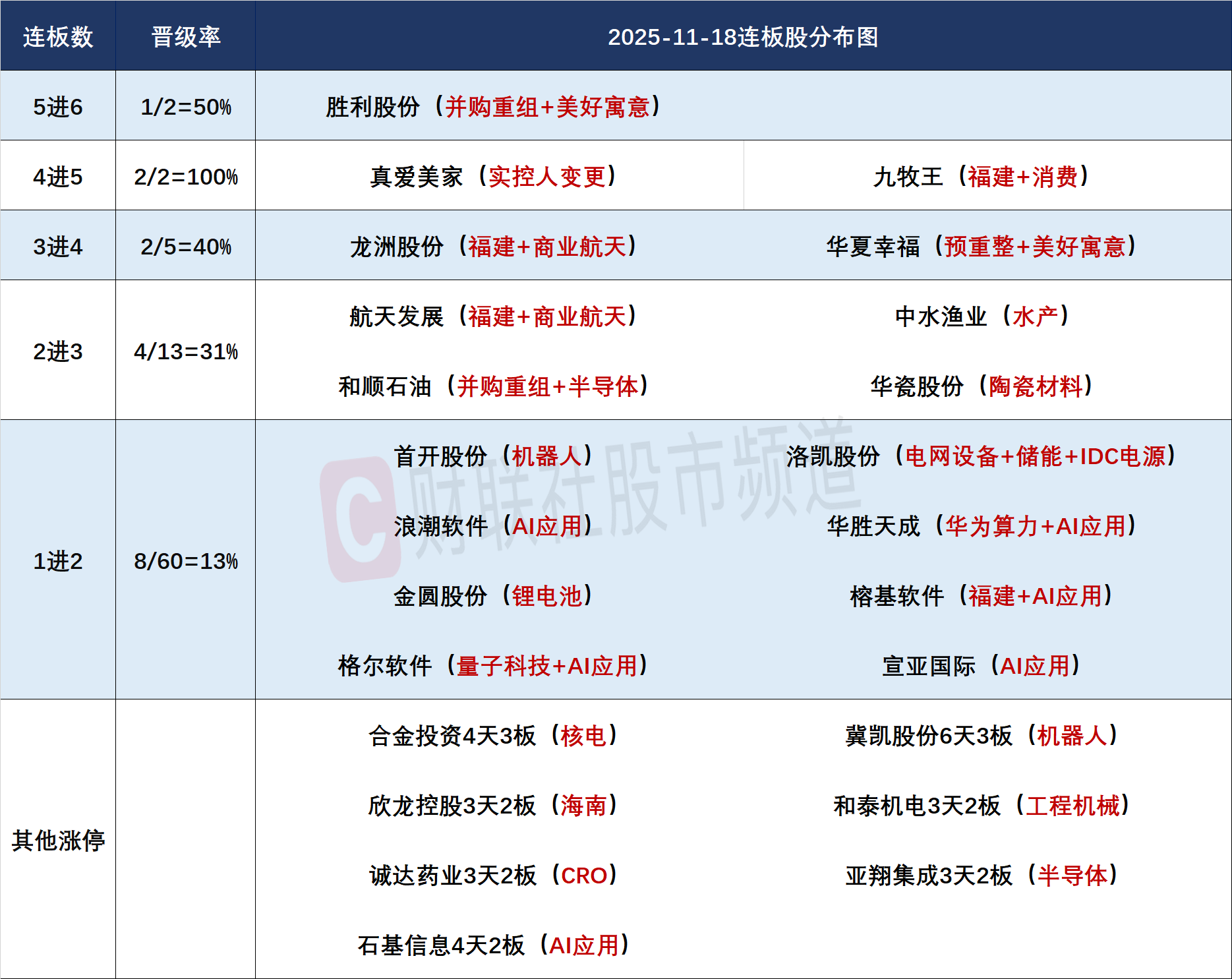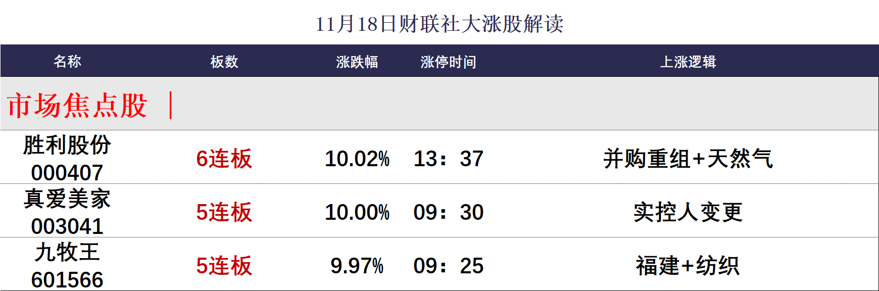 财联社11月18日电,今日午盘全市场共38股涨停,连板股总数15只,26股封板未遂,封板率为59%(不含ST股、退市股)。焦点股方面,并购重组的胜利股份6连板,实控人变更的真爱美家5连板,福建本地股九牧王5连板。