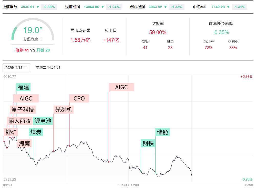 财联社11月18日电,市场全天震荡调整,三大指数低开低走,沪指、深成指盘中跌超1%。沪深两市成交额1.93万亿,较上一个交易日放量153亿。盘面上,市场热点较为杂乱,全市场超4100只个股下跌。从板块来看,AI应用概念逆势上涨,榕基软件、浪潮软件、宣亚国际、华胜天成2连板。半导体概念表现活跃,圣晖集成、龙迅股份涨停。机器人概念股局部走强,首开股份5天3板。下跌方面,近期热门题材调整,福建板块重挫,福建金森、福建水泥等多股跌停。锂电池板块震荡走弱,石大胜华跌停。板块方面,AI应用、软件开发等板块涨幅居前,电池、煤炭、钢铁等板块跌幅居前。截至收盘,沪指跌0.81%,深成指跌0.92%,创业板指跌1.16%。