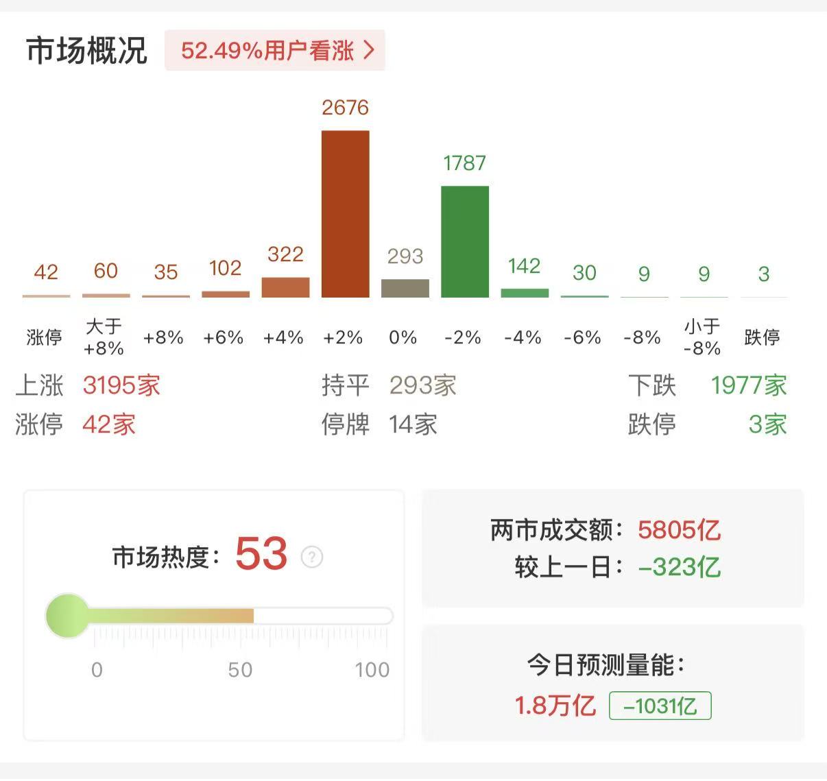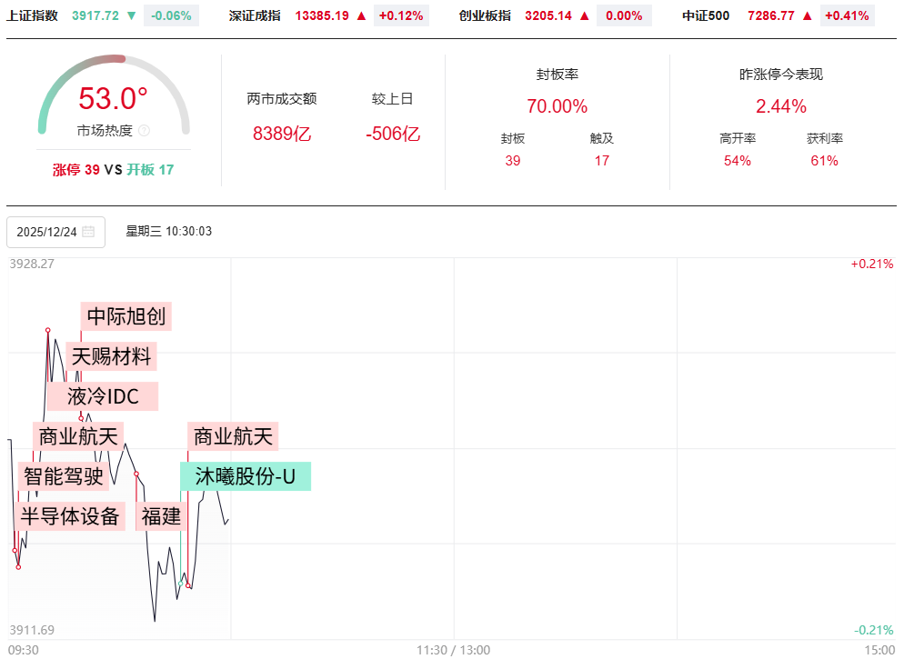 财联社12月24日电,市场早盘窄幅震荡,三大指数集体翻红。黄白两线严重分化,中小盘股表现较强。沪深两市半日成交额1.15万亿,较上个交易日缩量895亿。盘面上热点快速轮动,全市场超3800只个股上涨。从板块来看,商业航天概念持续走强,近20只成分股涨停,其中超捷股份20cm涨停,神剑股份5连板,九鼎新材、合众思壮、再升科技涨停。福建板块再度走强,安记食品7天4板,合兴包装3连板。半导体板块表现活跃,圣晖集成3连板。下跌方面,贵金属概念高开低走,山金国际、西部黄金下挫。乳业概念回调,庄园牧场触及跌停。截至收盘,沪指涨0.24%,深成指涨0.31%,创业板指涨0.08%。