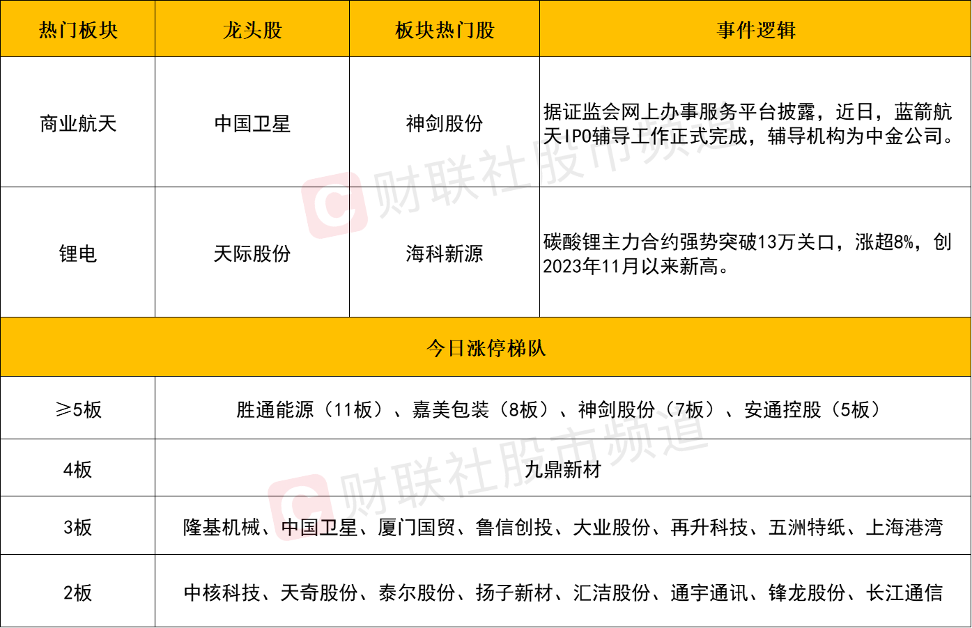 今日共81股涨停,连板股总数21只,其中三连板及以上个股14只,上一交易日共22只连板股,连板股晋级率63.63%(不含ST股、退市股)。个股方面,全市场超3400只个股下跌,但短线情绪不减,胜通能源开板后获资金踊跃接力晋级11连板,神剑股份一字涨停加速走出7连板。市场赚钱效应爆棚,二进三晋级率高达七成,浙江世宝、海南发展、海汽集团等人气股也纷纷反包。不过值得注意的是,再升科技、安通控股等个股放量分歧直至尾盘才封死涨停。板块方面,商业航天概念继续爆发,再升科技15天9板,神剑股份7连板,九鼎新材4连板,大业股份、鲁信创投、隆基机械、中国卫星、上海港湾均3连板;锂电产业链开盘走强,华联控股6天4板,天际股份8天4板,深圳新星4天2板,宏源药业、海科新源20CM涨停,永兴材料、永太科技、国城矿业等涨停,消息面上,碳酸锂主力合约盘中强势突破13万关口,日内涨超8%,创2023年11月以来新高。