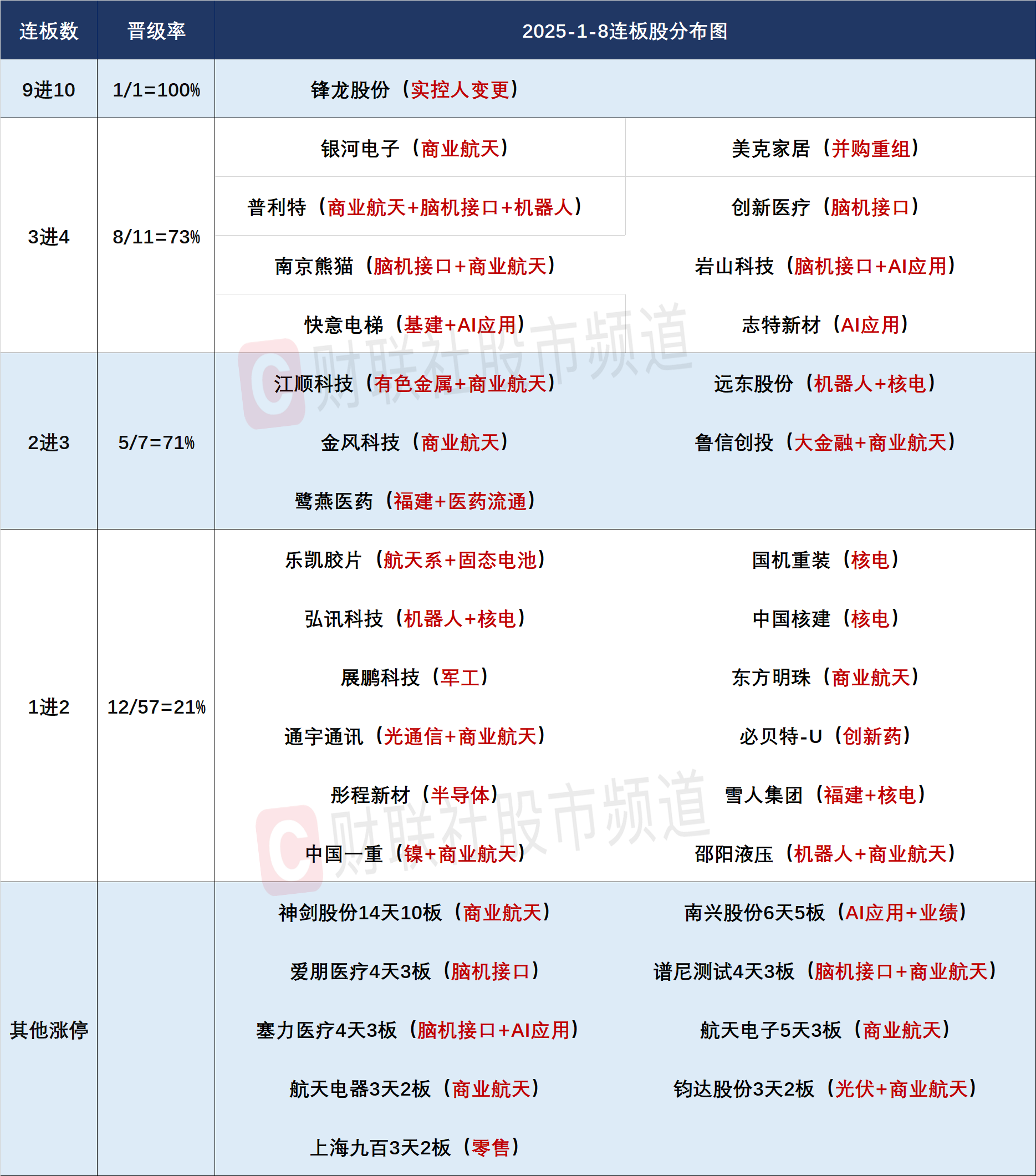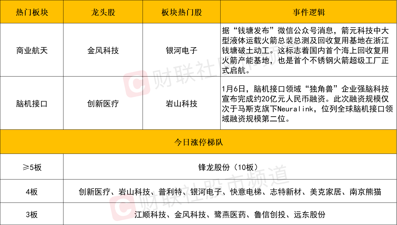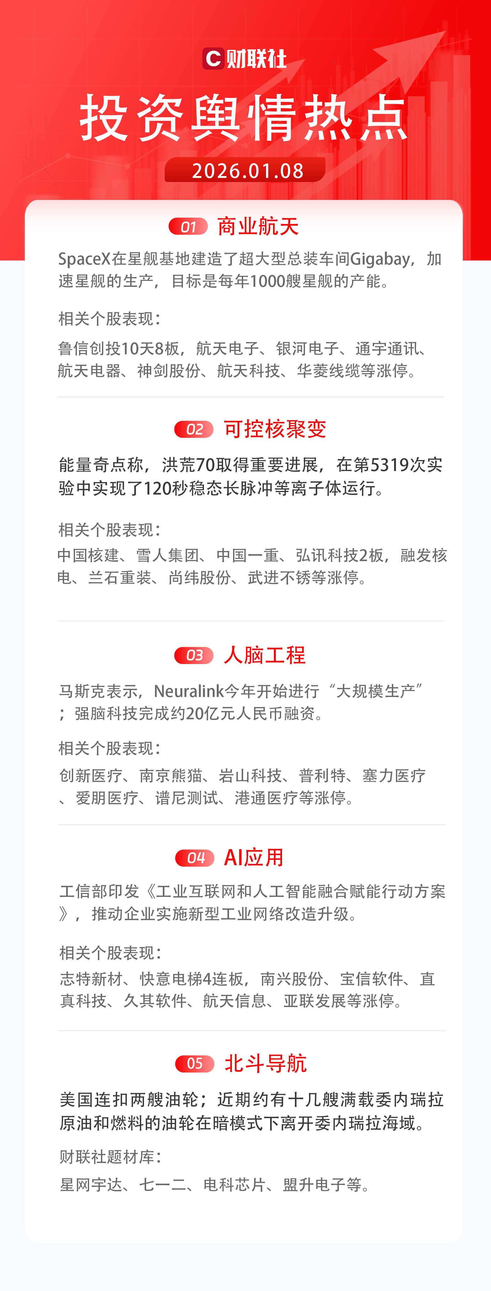 财联社1月9日电,上个交易日沪指窄幅震荡,创业板指盘中跌超1%。全市场超3700只个股上涨。沪深两市成交额2.8万亿,较前日缩量538亿,成交额连续4个交易日超2.5万亿。1)国内首个海上回收复用火箭产能基地—箭元科技中大型液体运载火箭总装总测及回收复用基地动工,此前持续火爆表现的商业航天概念再掀高潮,鲁信创投、金风科技、银河电子、邵阳液压、江顺科技实现连板晋级,泰胜风能、海兰信、航天宏图等众多低位20厘米个股封板。2)随着2026核聚变能科技与产业大会下周即将开幕,国内核聚变领域迎来催化的密集释放期,前日回暖的可控核聚变概念热度继续升温,弘讯科技、中国核建、融发核电、国机重装等多股实现连板晋级,合康新能、哈焊华通等涨超10%。3)“杭州六小龙”之一的强脑科技完成约20亿元融资,脑机接口概念走出分歧转一致走势,10厘米人气股普利特、创新医疗、岩山科技、南京熊猫实现3进4,爱朋医疗、塞力医疗强势反包走出4天3板,乐普医疗、当虹科技等多股纷纷实现反包修复。4)1月7日,工信部印发《工业互联网和人工智能融合赋能行动方案》,提出加快工业互联网与通算中心、智算中心、超算中心融合应用。国产算力产业链受此提振早盘爆发,海光信息一度涨超10%,摩尔线程、沐曦股份、寒武纪等盘中也大幅冲高。