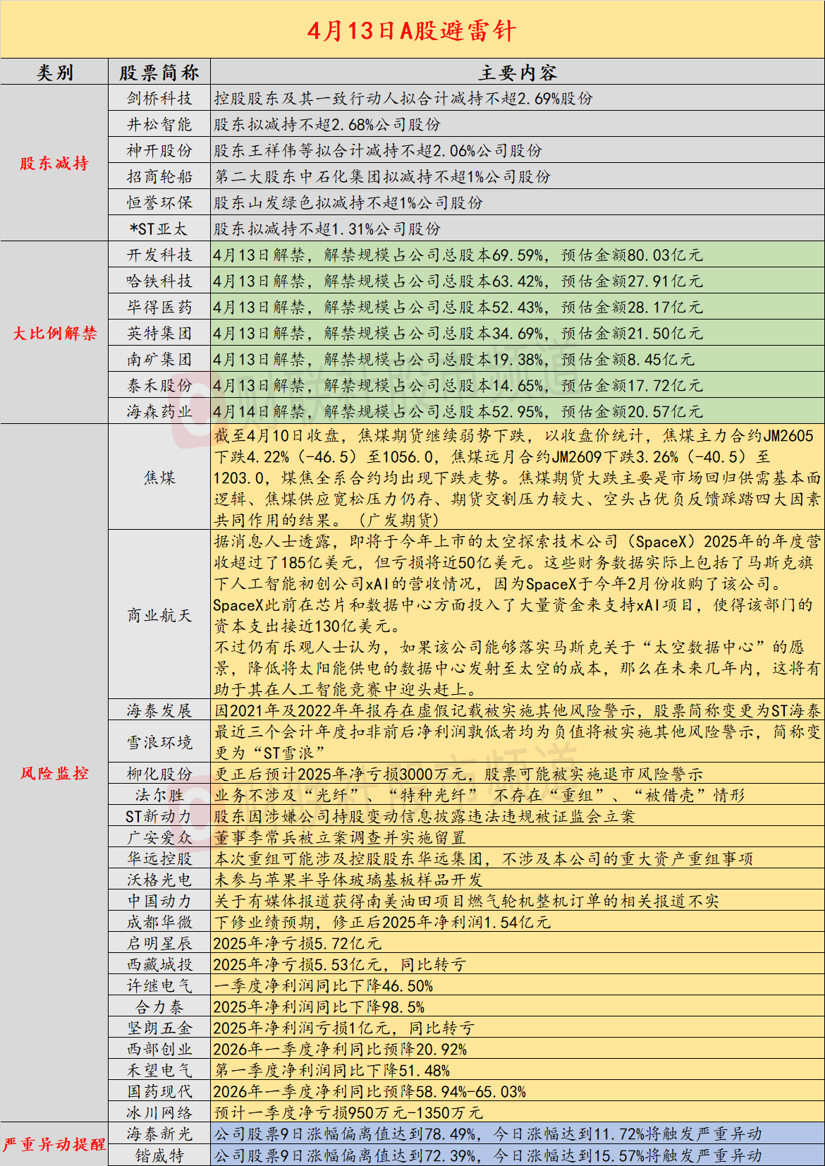 近日公告的A股拟减持的公司数量较之前有所增多,剑桥科技控股股东及其一致行动人拟合计减持不超2.69%股份,井松智能股东拟减持不超2.68%公司股份;开发科技、哈铁科技将迎来超六成以上解禁;北交所设置风险警示股票单日买入数量上限;海泰发展因2021年及2022年年报存在虚假记载被实施其他风险警示,股票简称变更为ST海泰;回归供需基本面逻辑,焦煤期货持续下跌;雪浪环境最近三个会计年度扣非前后净利润孰低者均为负值将被实施其他风险警示,简称变更为“ST雪浪”;美中央司令部将于4月13日起封锁伊朗港口海上交通,WTI原油与布伦特原油一度涨超9%。