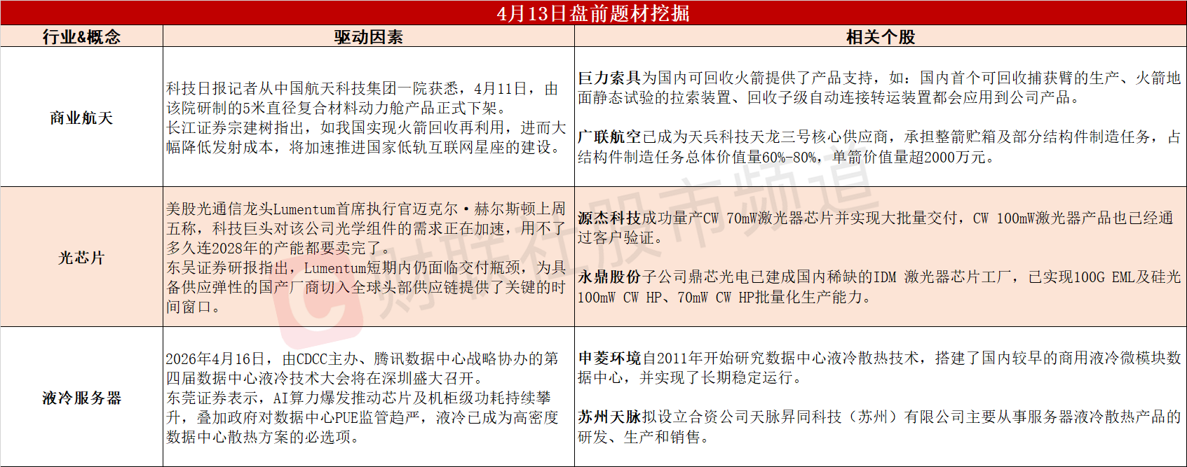 ①我国‌可重复使用火箭领域取得重大突破,商业航天有望迎加速发展。②美股光芯片龙头卖完2028年产能,国产厂商迎切入全球头部供应链机遇。③第四届数据中心液冷技术大会将召开,机构称液冷已成散热方案必选项。