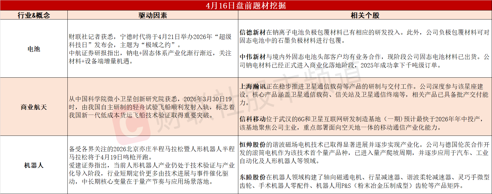 14、宁德时代公告,2025年度权益分派每10股派69.57元,股权登记日为4月21日;2026年一季度净利润207.38亿元,同比增长48.52%。另有公告称,拟注册资本300亿元设立时代资源集团,进一步向上游关键原材料领域实施延伸。