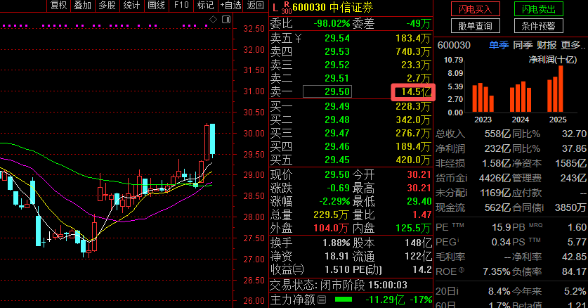 中信证券收盘集合竞价现14.5亿元压盘大单