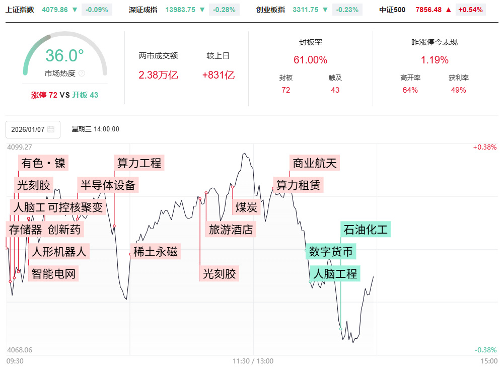 财联社1月7日电,沪指微涨录得14连阳,创业板指冲高回落。沪深两市成交额2.85万亿,较上一个交易日放量476亿,成交额连续2个交易日超2.8万亿。盘面上,市场热点快速轮动,全市场超3100只个股下跌。从板块来看,商业航天概念反复活跃,十余只成分股涨停,雷科防务6连板,金风科技2连板。煤炭板块持续拉升,大有能源、陕西黑猫涨停。半导体设备股延续强势,中微公司、北方华创大涨续创历史新高。光刻胶概念表现活跃,国风新材3天2板,南大光电、彤程新材涨停。可控核聚变概念震荡走强,中国一重、中国核建涨停。下跌方面,脑机接口概念震荡回落,诚益通、爱朋医疗跌超10%。截至收盘,沪指涨0.05%,深成指涨0.06%,创业板指涨0.31%。