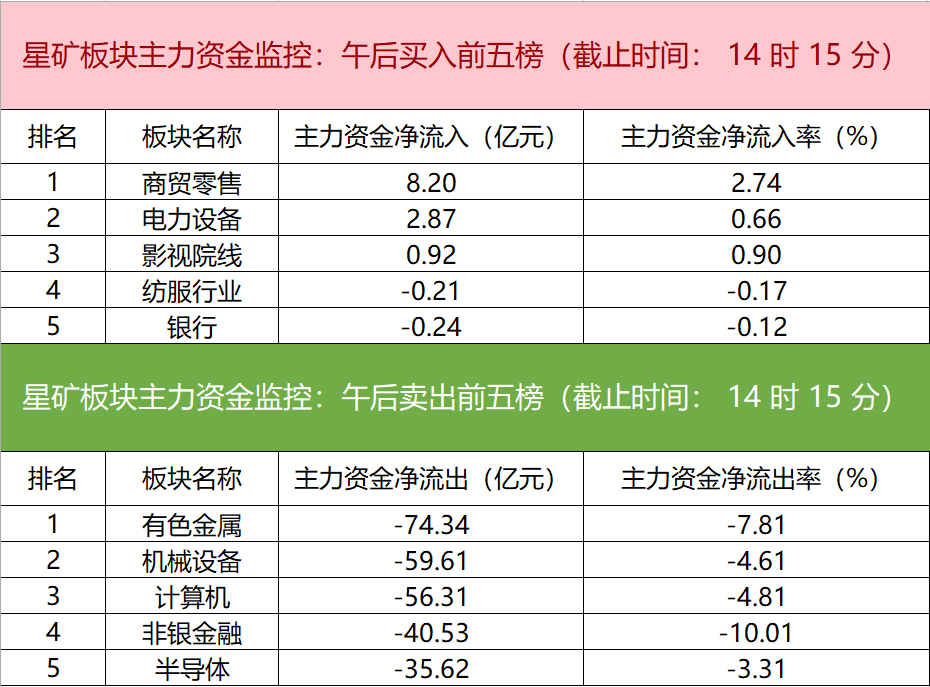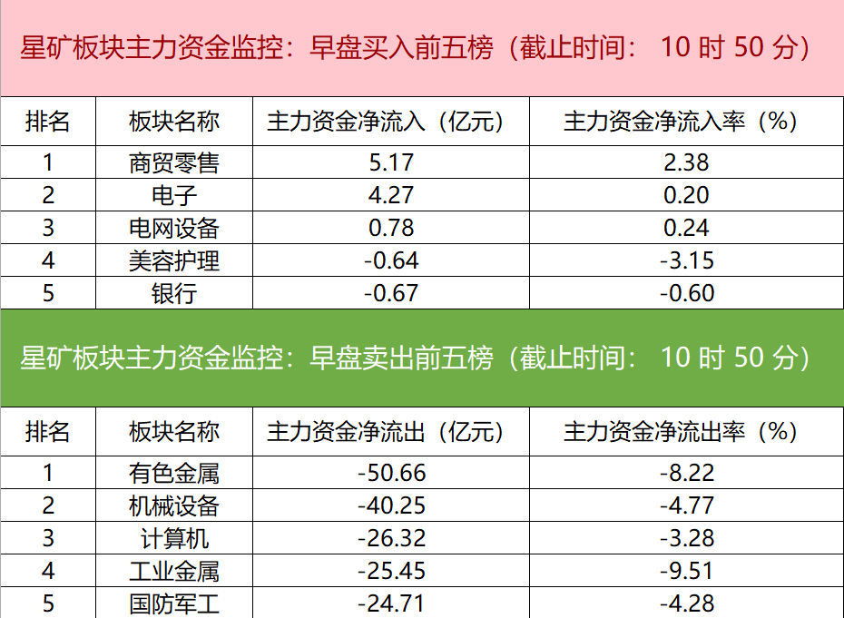 财联社12月10日电,财联社星矿数据显示,今日主力资金净流入房地产、商贸零售、农林牧渔等板块,净流出电子、电新行业、计算机等板块,其中电子板块净流出超142亿元。个股方面,N百奥主力资金净买入7.12亿元位居首位,永辉超市、万科A、神农种业主力资金净流入居前;工业富联遭净卖出超20亿元位居首位,阳光电源、胜宏科技、天孚通信主力资金净流出额居前。