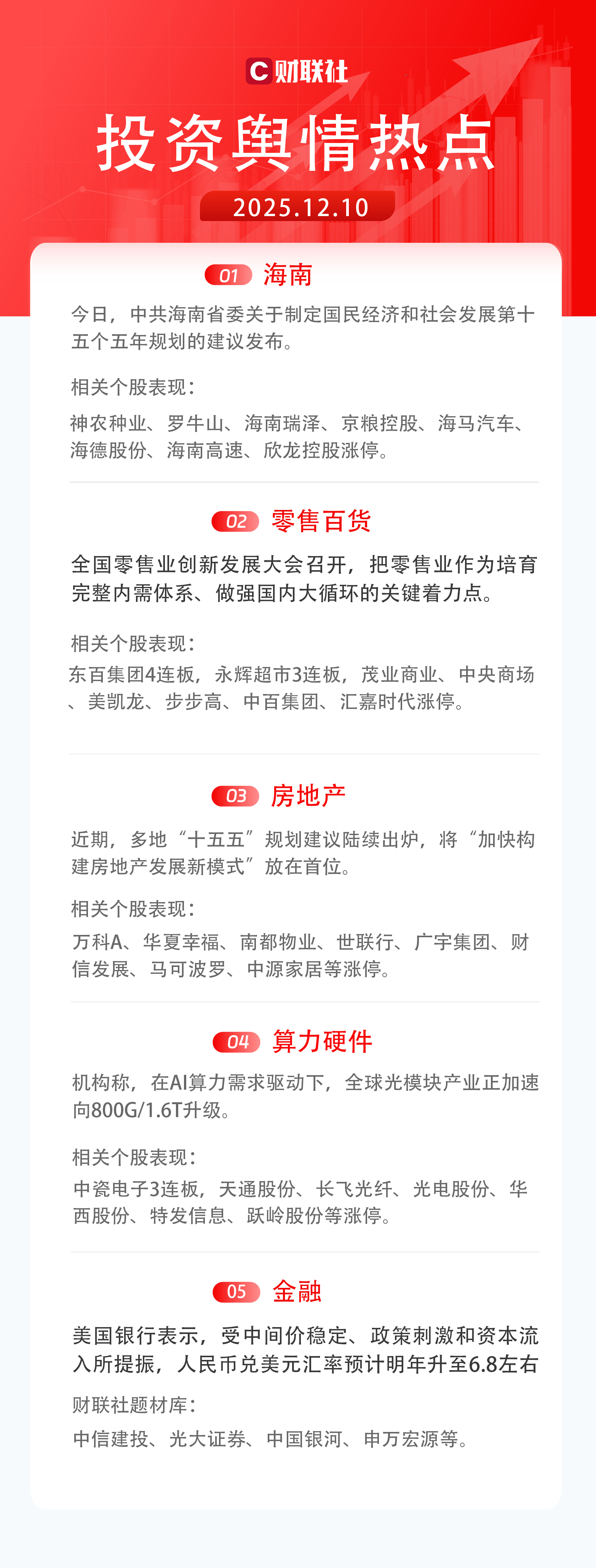 财联社12月10日电,市场探底回升,三大指数涨跌不一,深成指、创业板指盘中先后翻红,创业板指此前一度跌超2%。沪深两市成交额1.78万亿,较上一个交易日缩量1254亿。盘面上,市场热点快速轮动,全市场超2800只个股下跌。从板块来看,海南板块持续走强,罗牛山、海南瑞泽等多股涨停。零售概念表现活跃,永辉超市3连板,茂业商业、中央商场2连板。算力硬件概念回暖,新易盛再创历史新高,长飞光纤涨停。下跌方面,银行板块走弱,招商银行、农业银行下挫。板块方面,海南、贵金属、零售等板块涨幅居前,培育钻石、银行、有机硅等板块跌幅居前。截至收盘,沪指跌0.23%,深成指涨0.29%,创业板指跌0.02%。