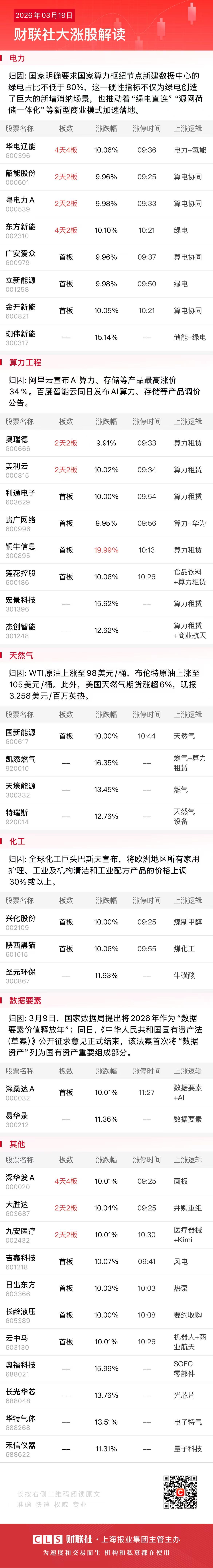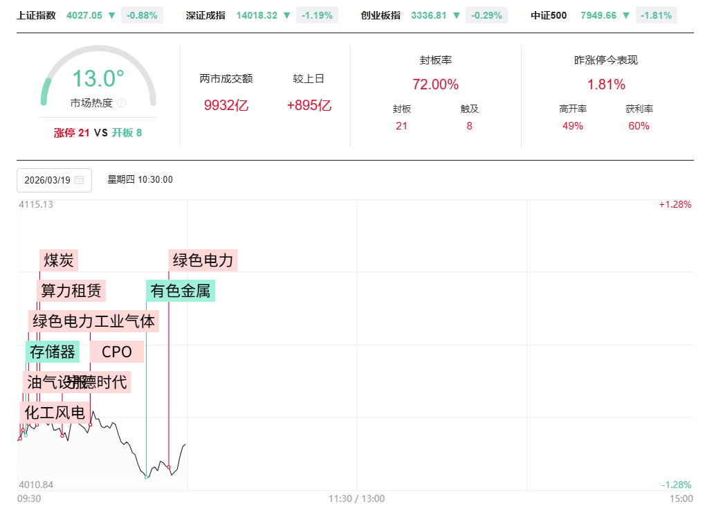 财联社3月19日电,市场早盘震荡调整,沪指跌近1%,深成指跌逾1%。沪深两市半日成交额1.3万亿,较上个交易日放量649亿。盘面上题材弱势轮动,全市场4700只个股下跌。从板块来看,绿电、算电协同概念逆势走强,金开新能、东方新能、粤电力A、韶能股份、广安爱众、华电辽能涨停,珈伟新能触及20CM涨停。算力硬件概念震荡回升,源杰科技涨8%,创历史新高,长光华芯涨超10%。算力租赁概念反复活跃,美利云2连板,贵广网络、铜牛信息、利通电子涨停。下跌方面,有色金属板块跌幅居前,威领股份、山金国际、中金黄金、宝武镁业纷纷下挫。截至收盘,沪指跌0.95%,深成指跌1.11%,创业板指跌0.11%。