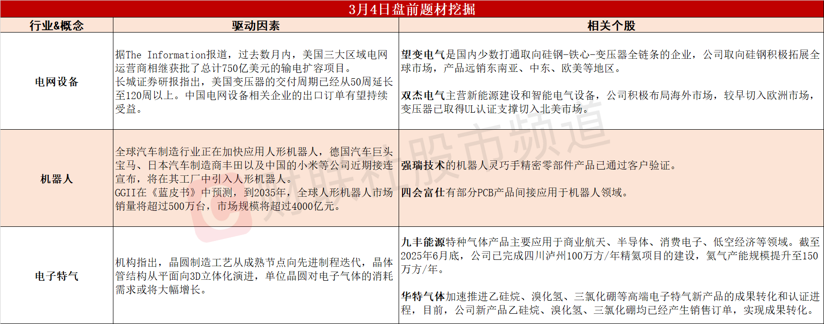 ①美国电网将迎史诗级扩建,中国电网设备出口订单或持续受益。②汽车行业加快应用人形机器人,相关供应链企业投资价值凸现。③先进制程推动需求增长,电子气体市场有望迎超预期扩张。