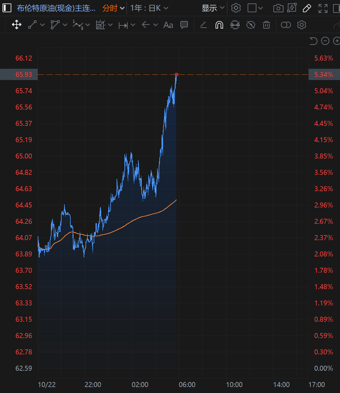 财联社10月23日电,受欧美对俄罗斯石油实施制裁影响,国际油价随之大幅攀升。WTI原油涨5.51%,报61.721美元/桶;布伦特原油涨5.31%,报65.911美元/桶。
