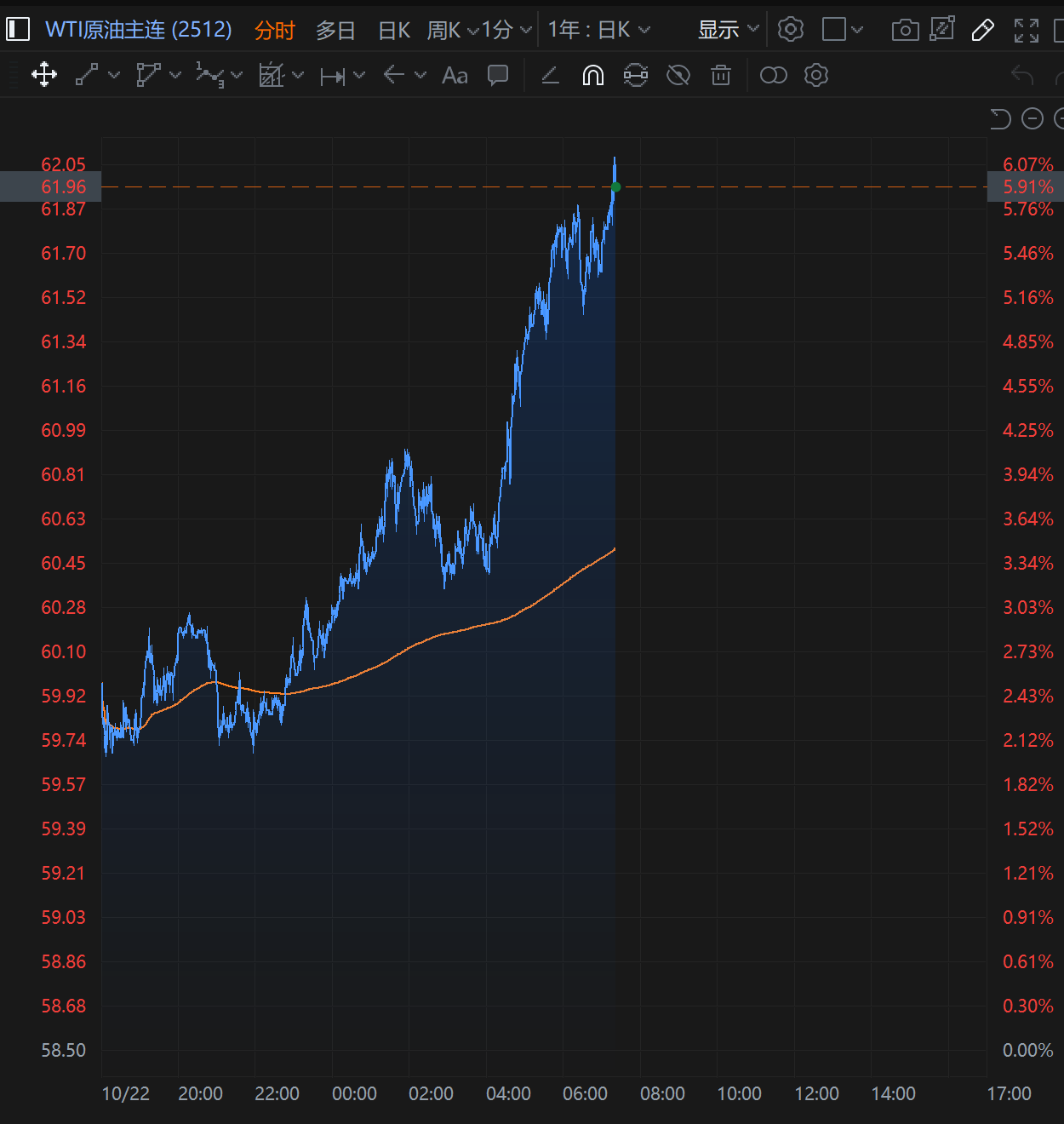 财联社10月24日电,WTI原油期货主力合约日内涨幅达1%,报62.41美元/桶。