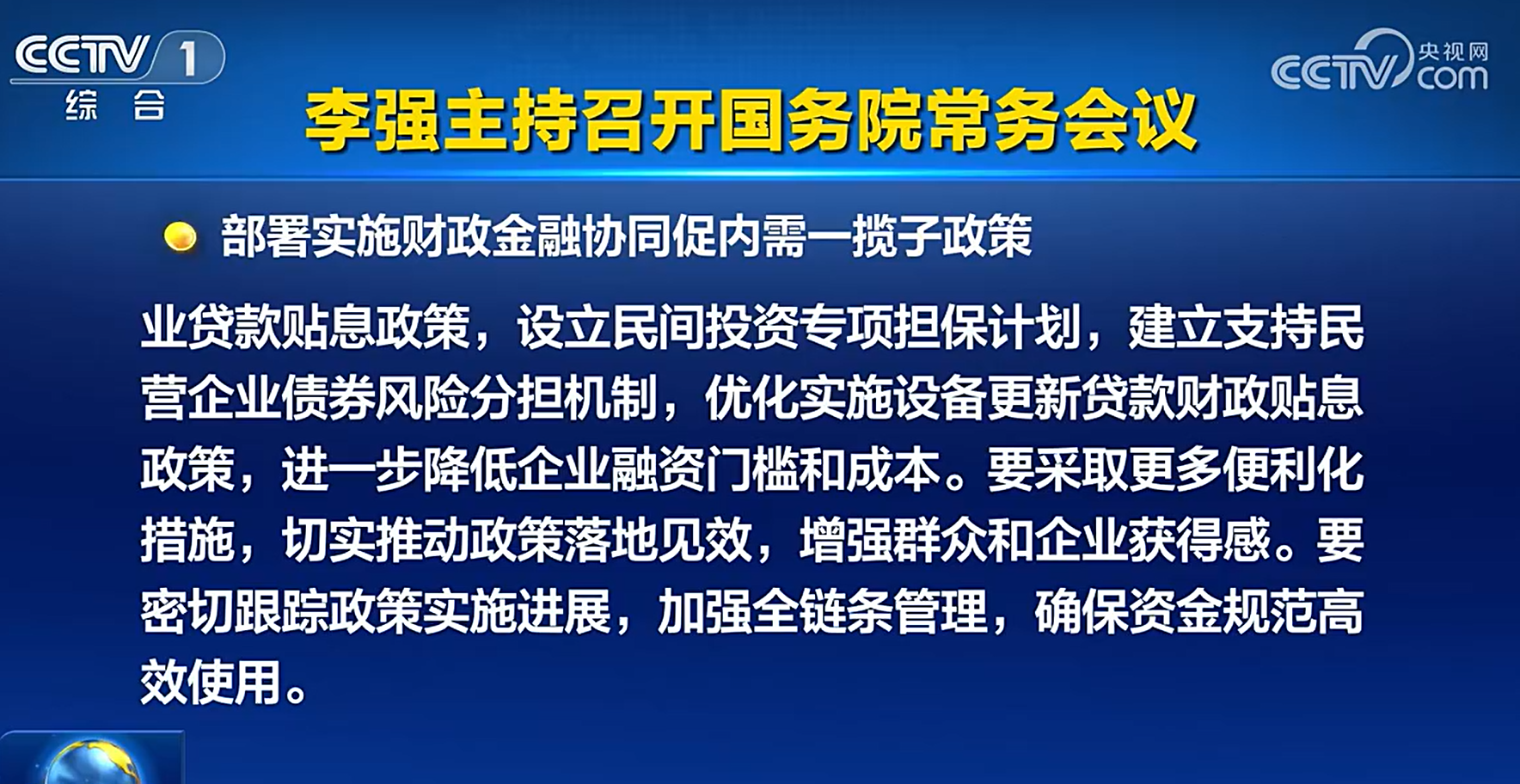 财联社1月9日电,据央视新闻,国务院总理李强1月9日主持召开国务院常务会议,部署实施财政金融协同促内需一揽子政策,研究推行常住地提供基本公共服务有关工作,审议通过《中华人民共和国自然保护区条例(修订草案)》。会议指出,实施财政金融协同促内需一揽子政策,是扩大有效需求、创新宏观调控的重要举措。要加强财政政策与金融政策配合联动,充分发挥政策效应,引导社会资本参与促消费、扩投资。围绕促进居民消费,优化实施服务业经营主体贷款、个人消费贷款贴息政策,推动增加优质服务供给,增强居民消费能力。围绕支持民间投资,实施中小微企业贷款贴息政策,设立民间投资专项担保计划,建立支持民营企业债券风险分担机制,优化实施设备更新贷款财政贴息政策,进一步降低企业融资门槛和成本。要采取更多便利化措施,切实推动政策落地见效,增强群众和企业获得感。要密切跟踪政策实施进展,加强全链条管理,确保资金规范高效使用。