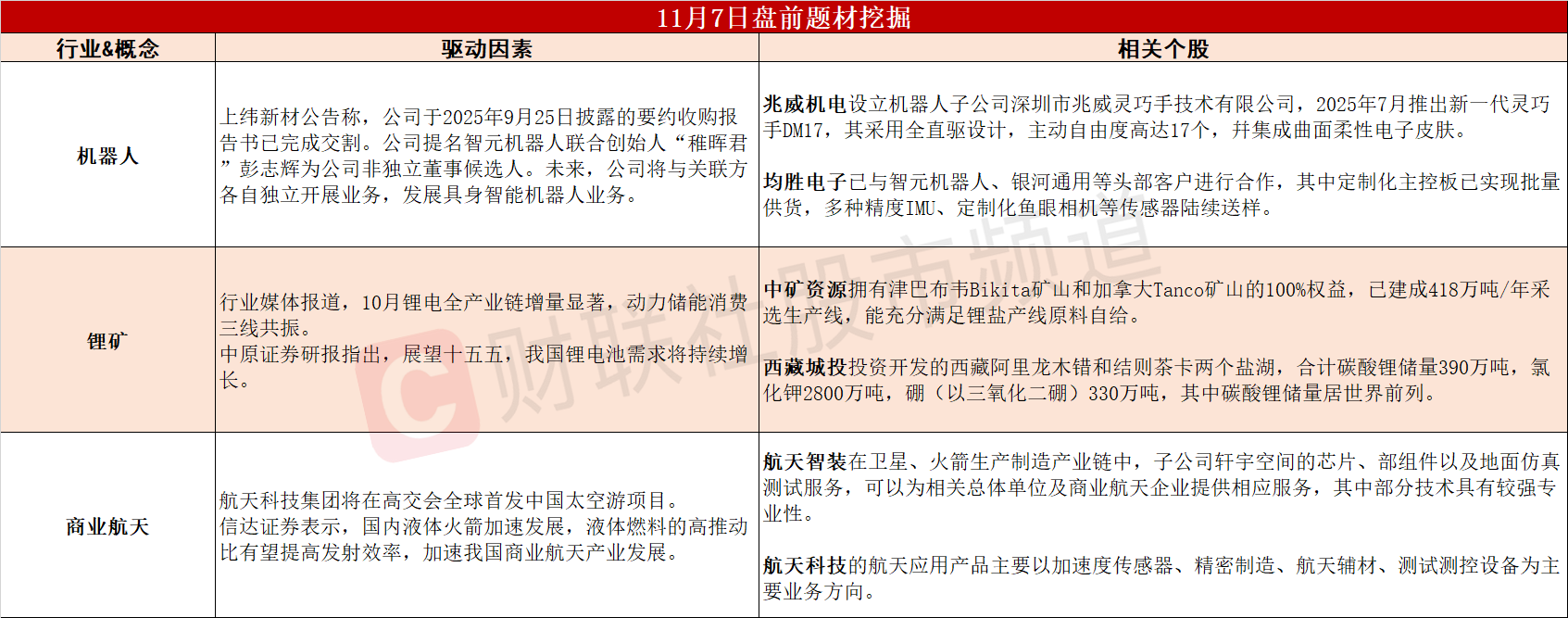 ①上纬新材要约收购高效落地,人形机器人产业加速崛起。②动力储能消费三线共振,锂矿企业有望走出低谷。③中国太空游项目将在高交会全球首发,商业航天板块有望站上风口。